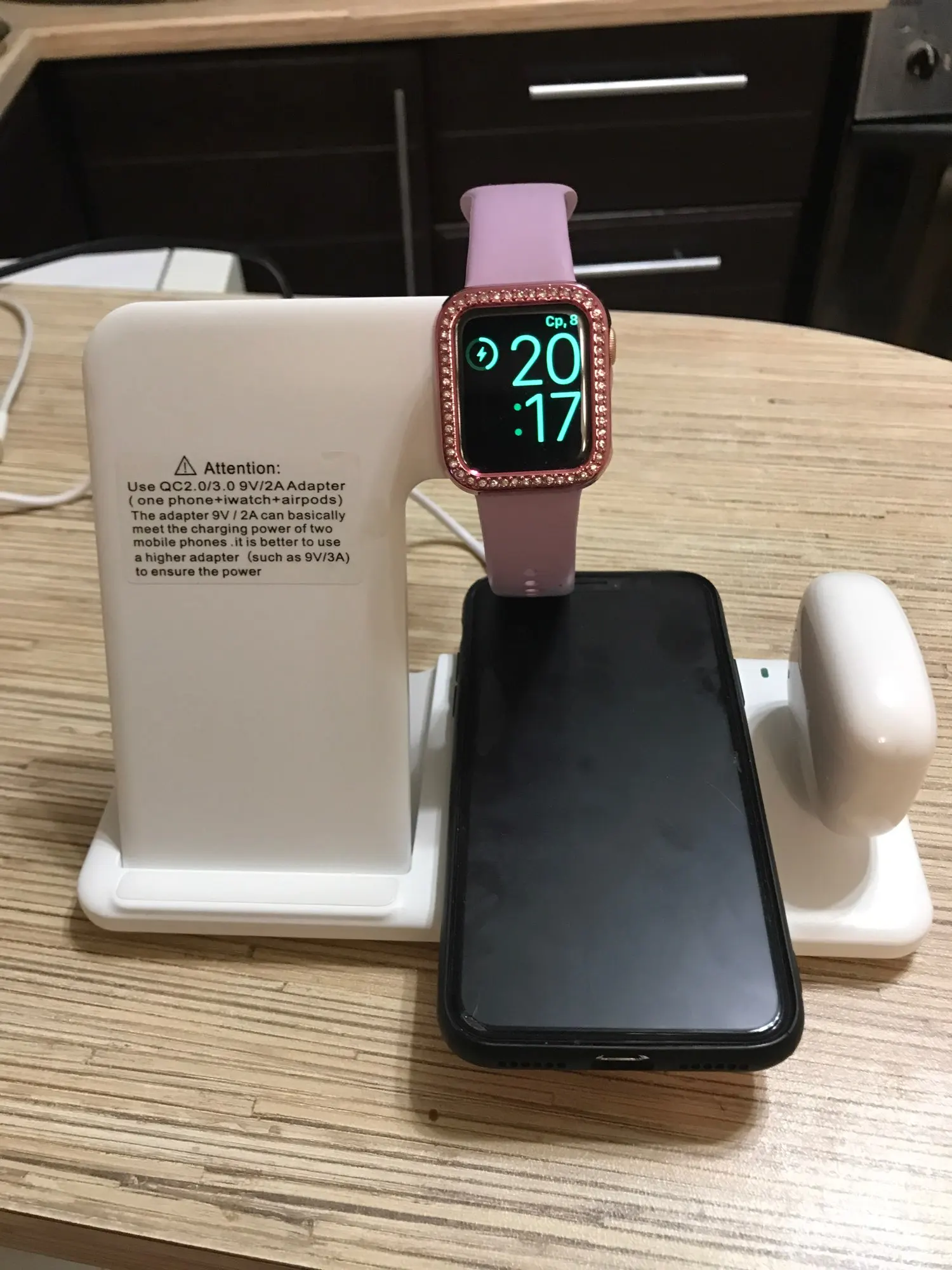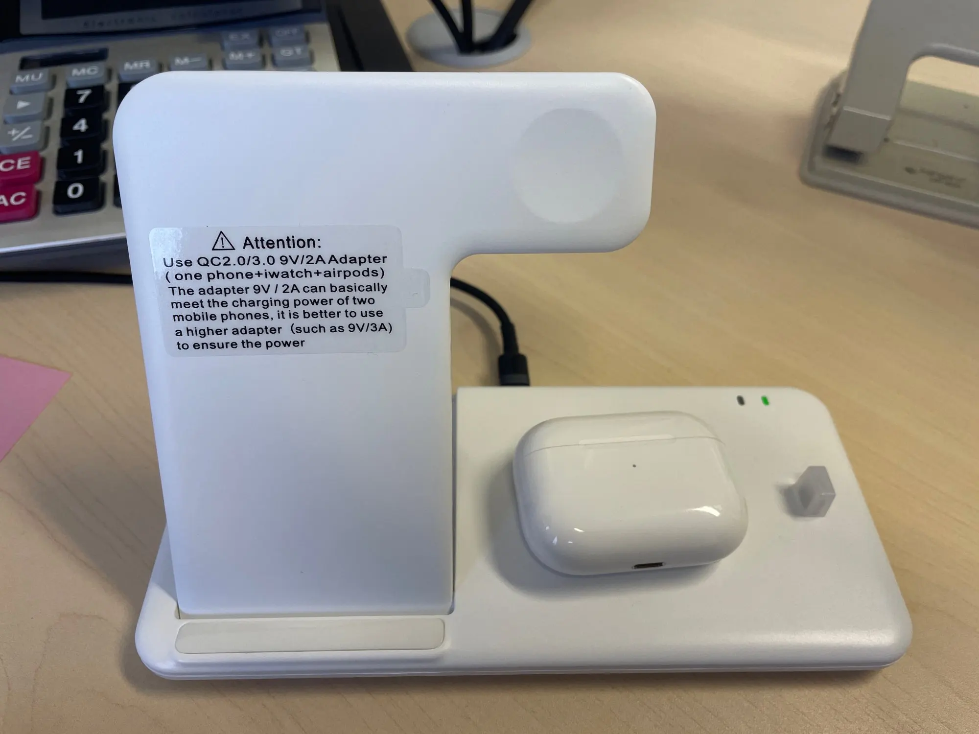 Все отлично работает, заряжает и телефоны, и часы, и наушники (AirPods pro) по беспроводной. Боялась, что будет пищать во время работы, но никаких звуков не издаёт вообще, работает тихо. Использую блок на 2А, маловато для зарядки нескольких устройств сразу - заряжает медленно.