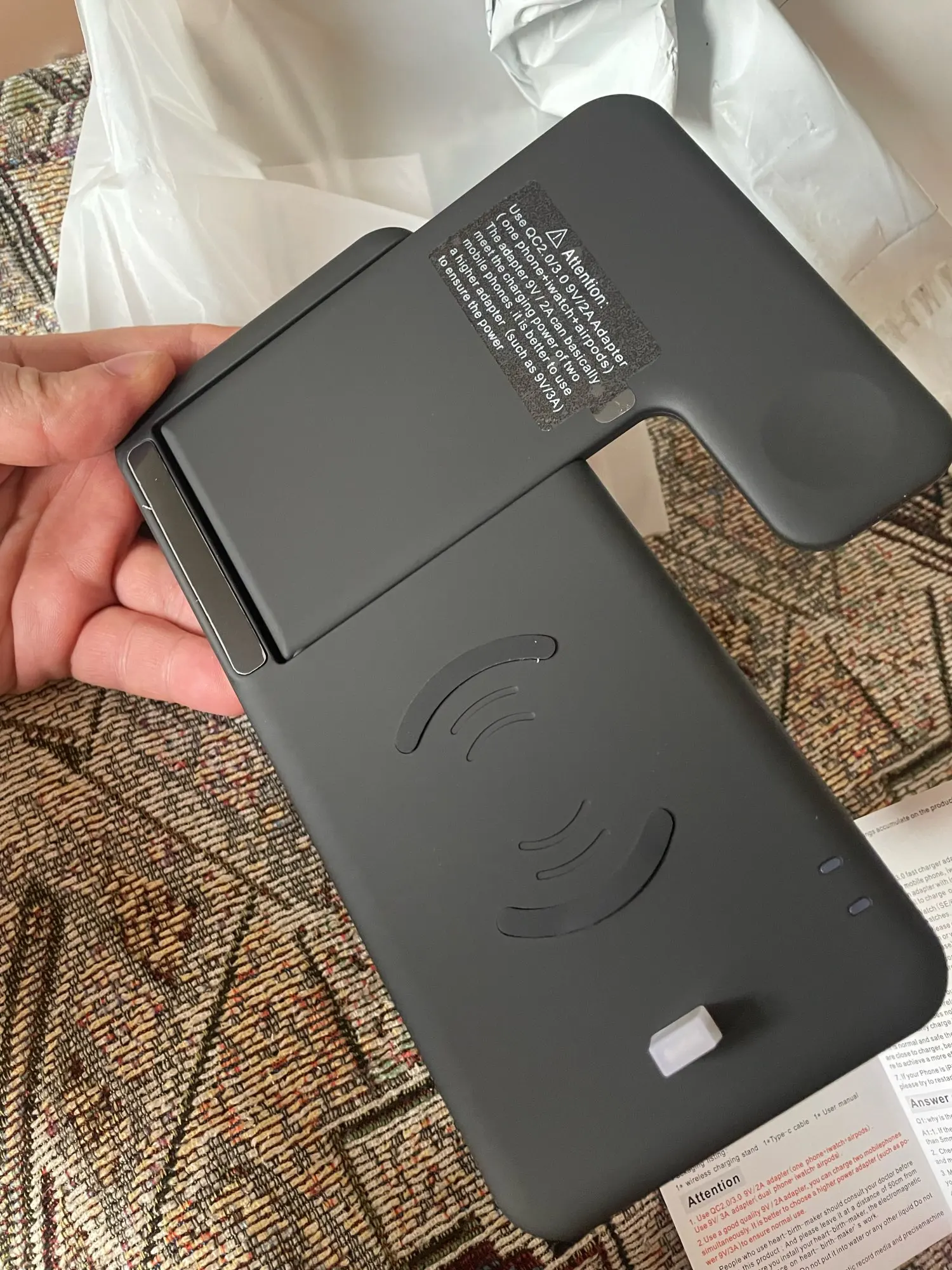 Я рад! Заказ должен был прибыть на день 30 октября и прибыл сегодня 18 октября, за 2 недели до этого! Только что получил и, кажется, в хорошем состоянии. Поставляется с зарядным кабелем, но не поставляется с зарядным гнездом. Все еще не протестирована скорость зарядки, но увидел, что работает с несколькими вещами одновременно. Визуально выглядит так, как показано на фотографиях. Внешнее зарядное устройство из пластика, с черным металлом для поддержки веса iPhone и iWatch! Опора Очень легкая, поэтому ее легко переносить.