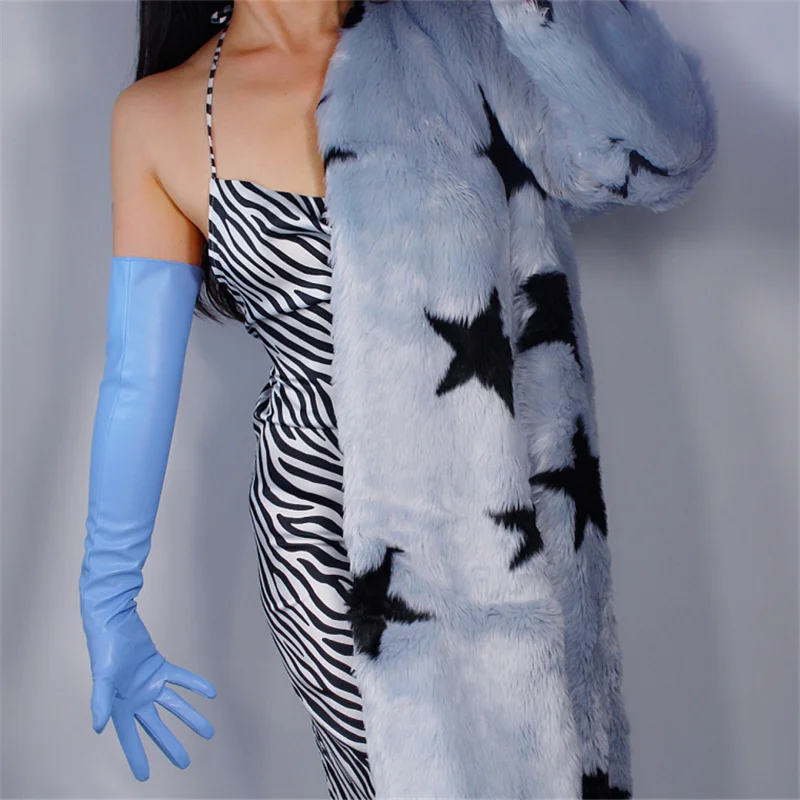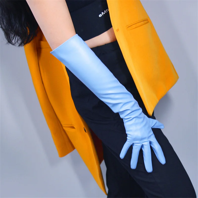 Длинные кожаные перчатки 50 см, имитация кожи, искусственная кожа, овчина, сапфировый светильник, синий небесно-голубой PUQL-5