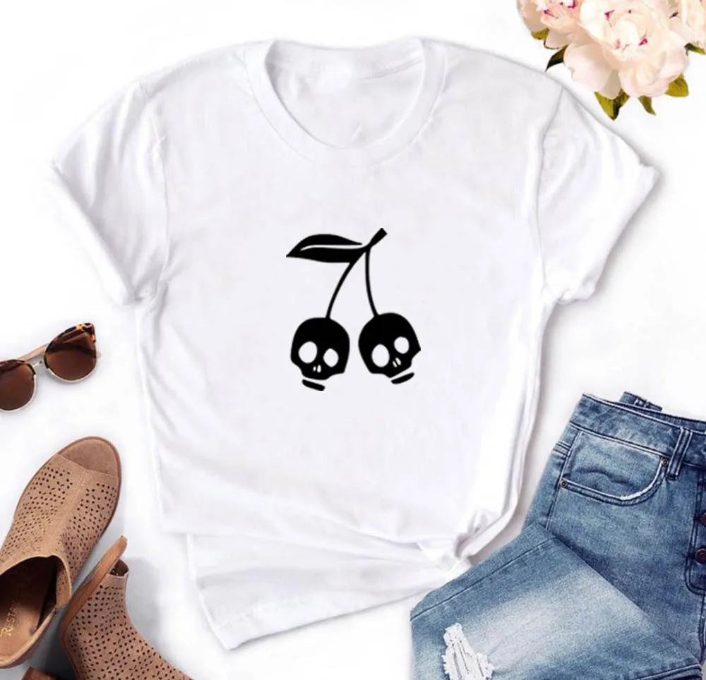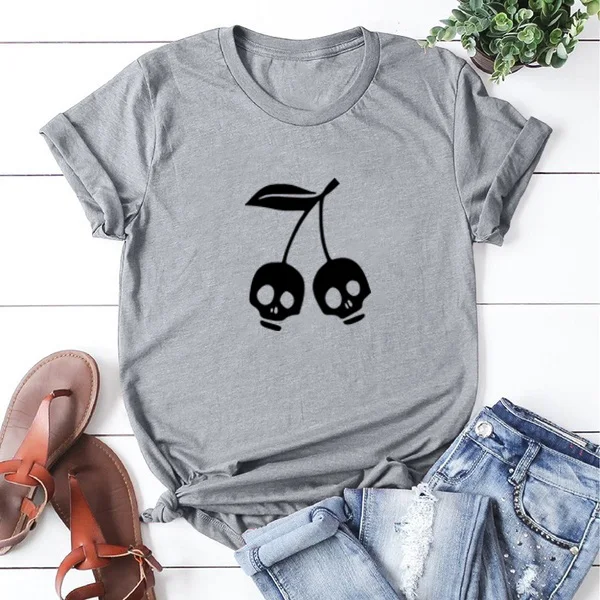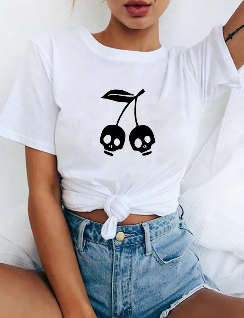 Футболка женская с графическим принтом черепа вишни, топ с коротким рукавом и круглым вырезом, хлопковая рубашка черного и белого цвета, на лето