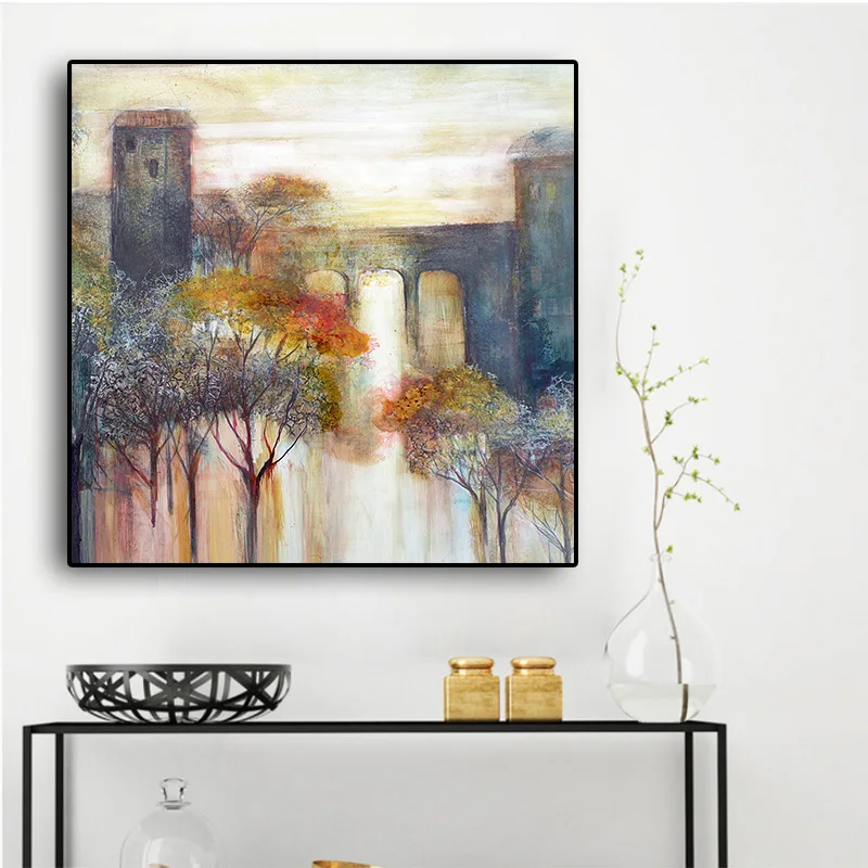 Винтажная абстрактная картина с деревьями и озерами, пейзаж маслом на холсте, Куадрос, плакаты и принты, Настенная картина для гостиной