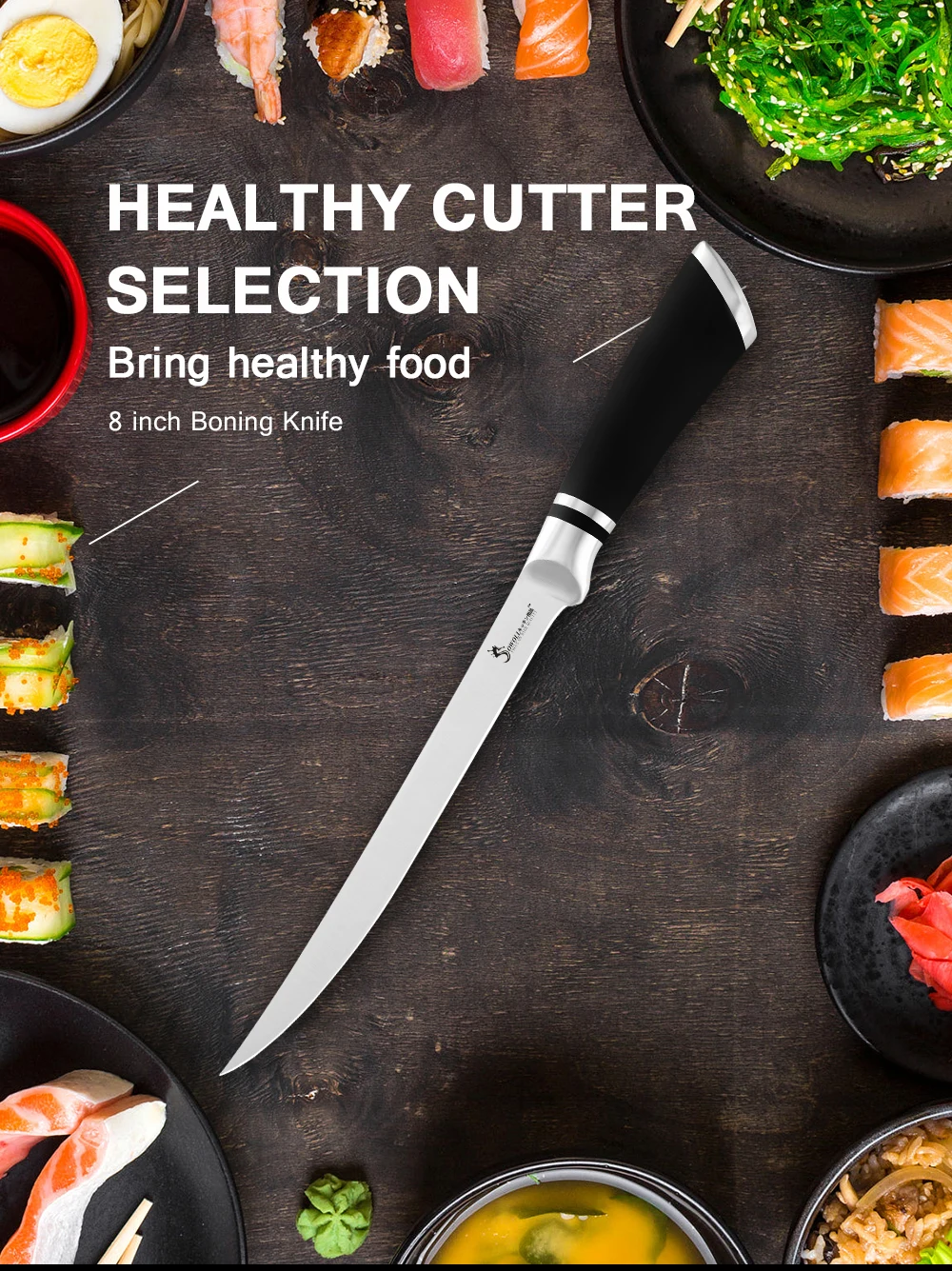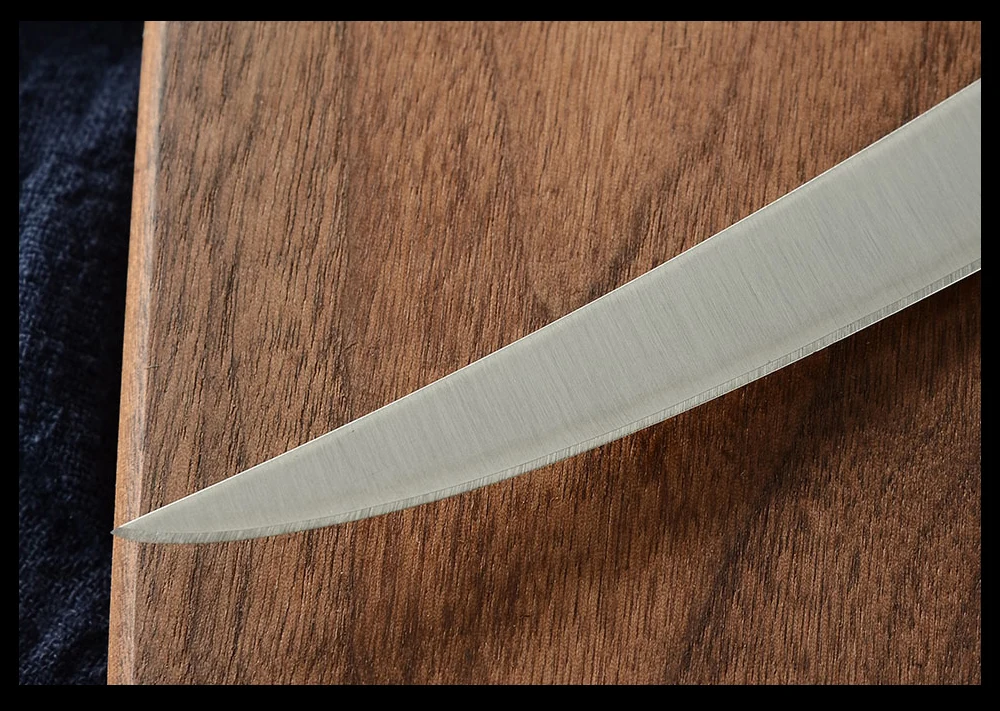 Скрепляющий стальный кухонный нож из нержавеющей стали-кончик острого и эластичного ножа, подходит для удаления костей, жира и фасцииЭргономичная ручка обеспечивает превосходный комфорт и Нескользящий Захват даже с мокрыми руками. Не сломается от воздействия кухонных масел и способен выдерживать жаркую и холодную температуру.Высокоуглеродистая, не пятнистая японская сталь для столовых приборов устойчива к ржавчине, коррозии и обесцвечиванию. Точная кованая конструкция для лучшей прочности и долговечности.Кромка с коническим заземлением обеспечивает дополнительную стабильность, легкость в заточении, долговечность и повышенную эффективность при резке и измельчении.