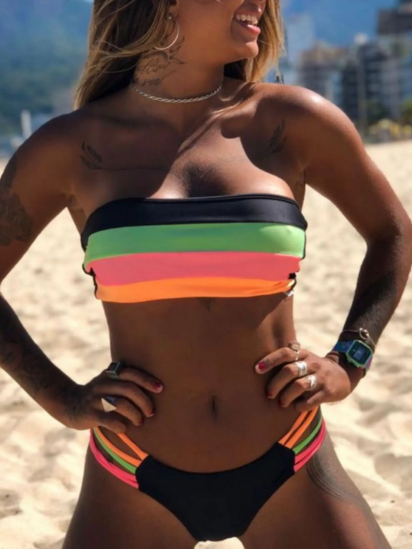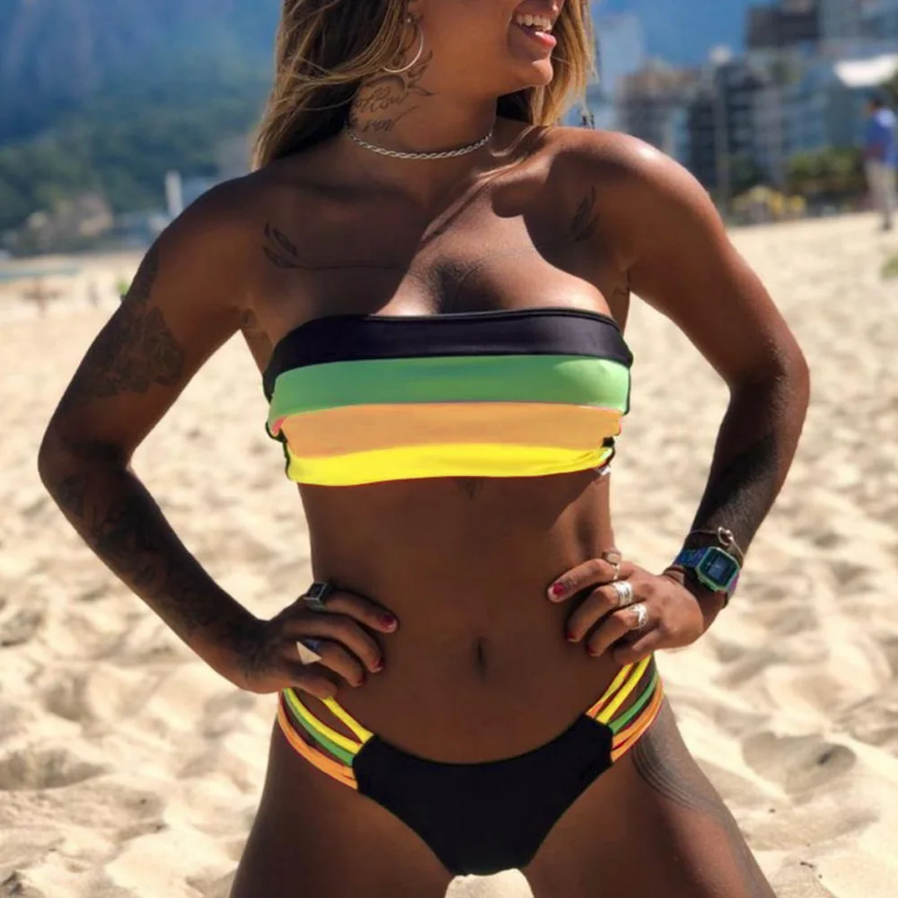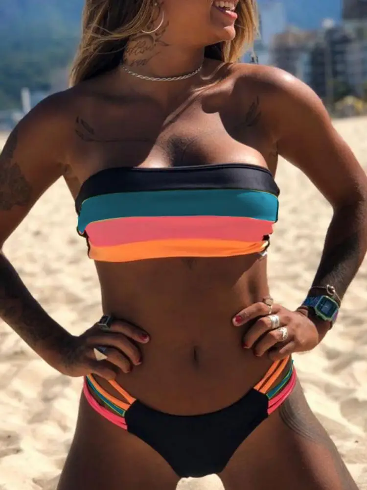 Бикини 2022, женский купальник с принтом в полоску, женский купальный костюм, комплект микро-бикини, радужная пляжная одежда-бандо, летнее бразильское бикини