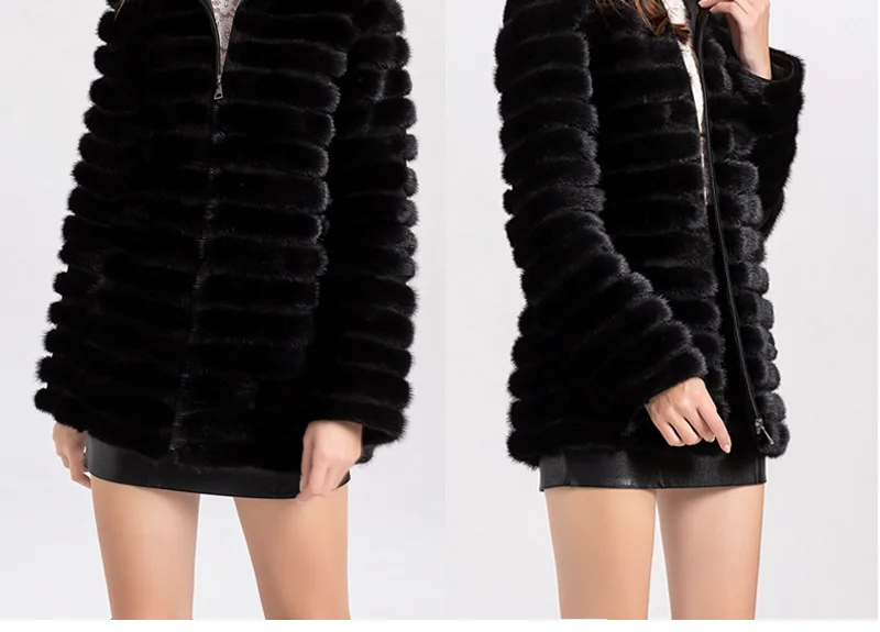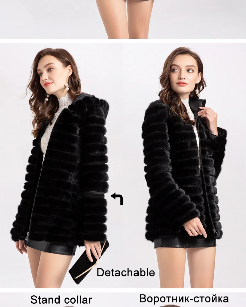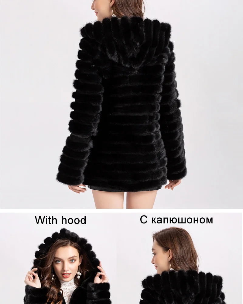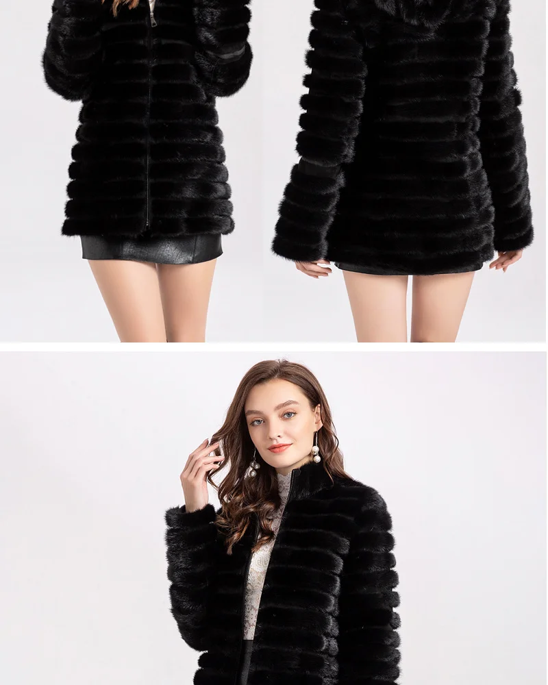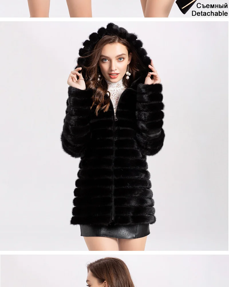 Шуба из натурального меха норки женская зимняя черная с капюшоном 2022