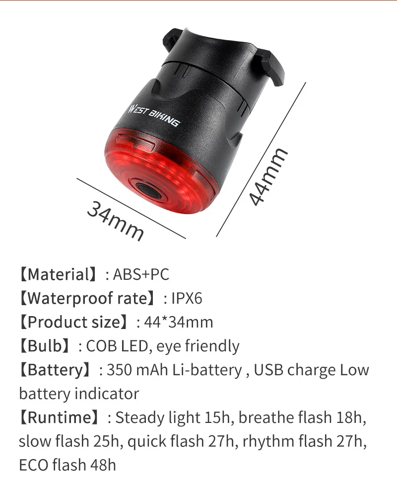 Велосипедный задний фонарь WEST BIKING, водонепроницаемый, IPx6, за...