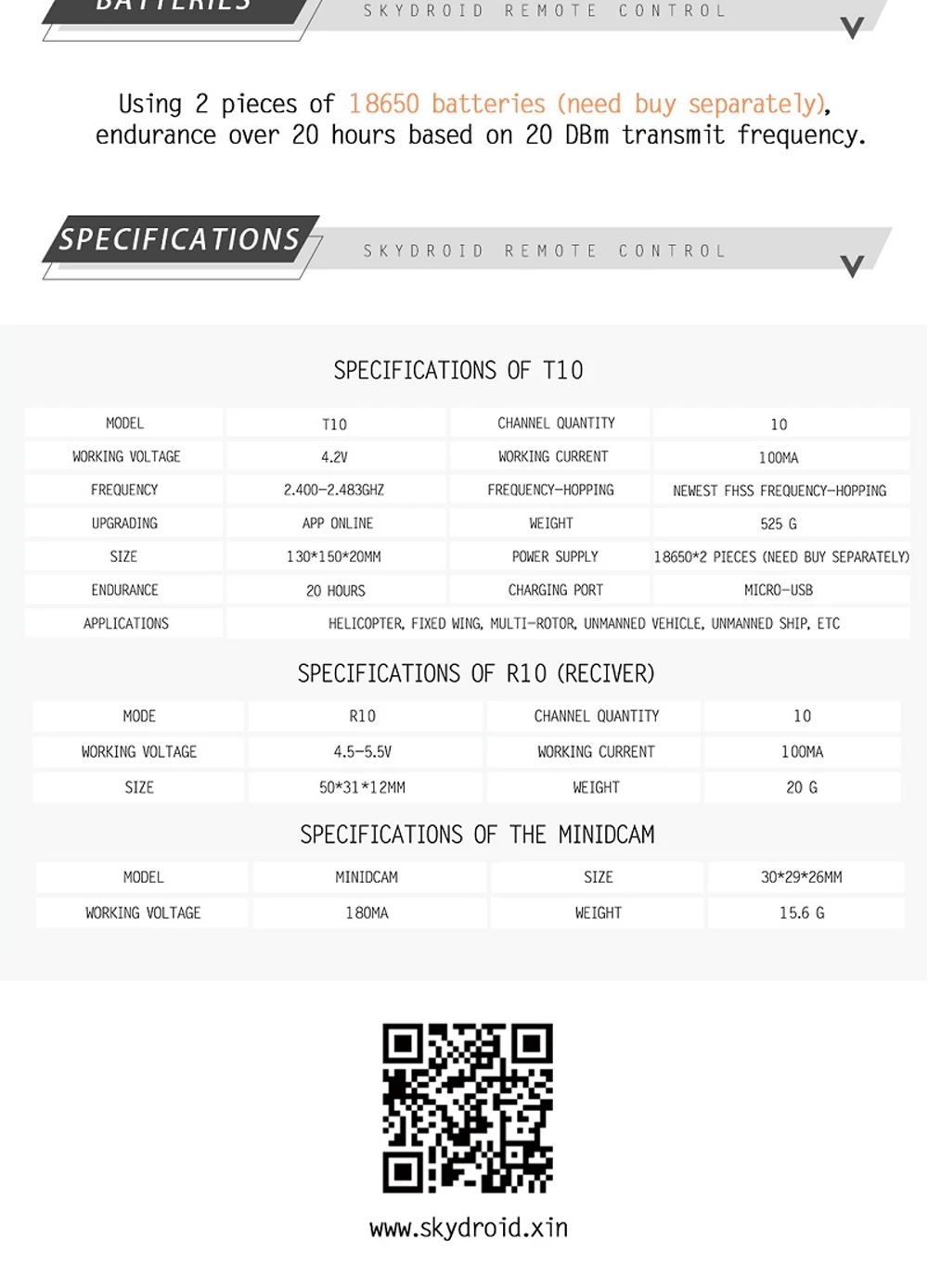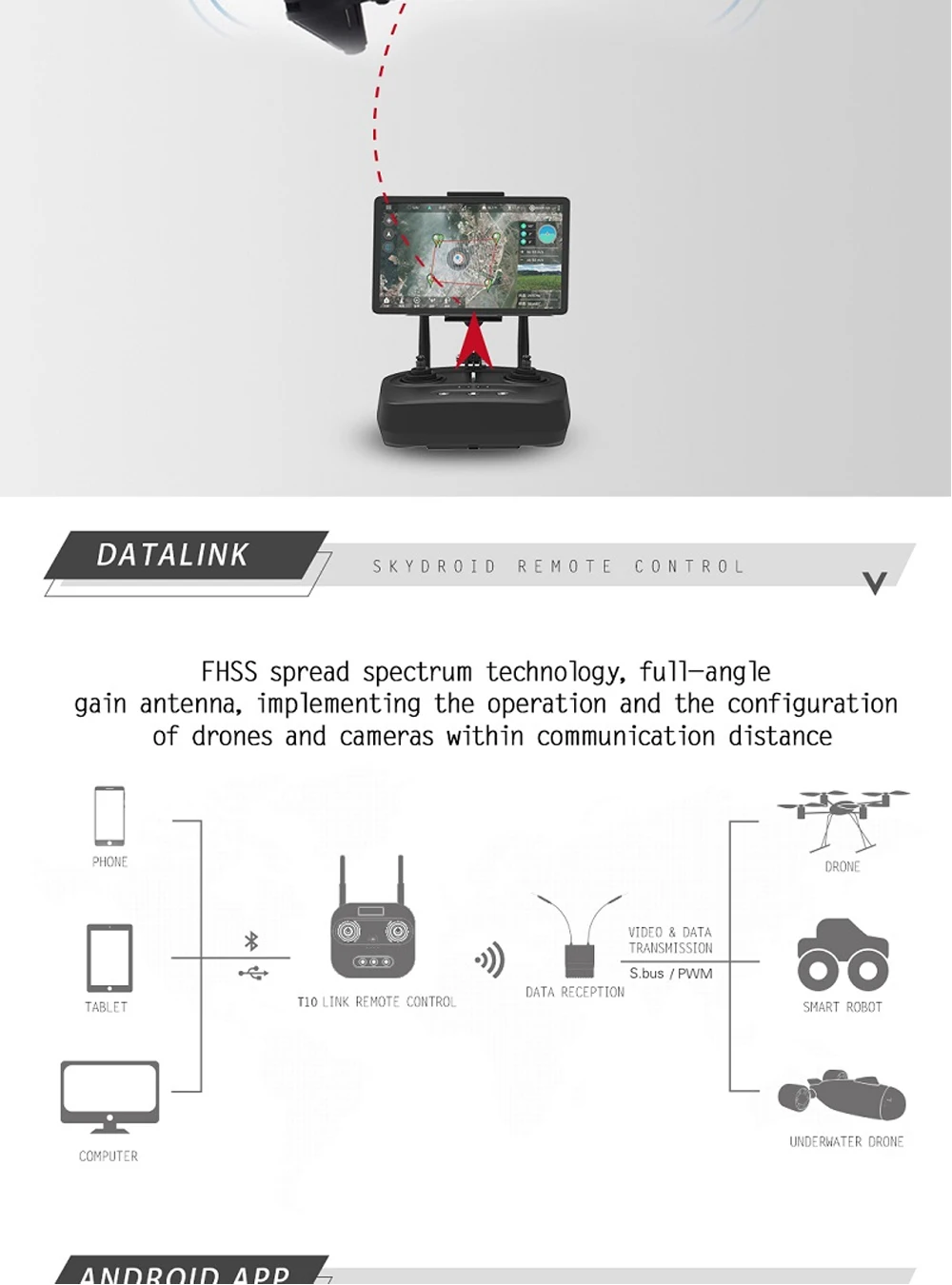 -Двойная антенна плюс двойной радиочастотный модуль с интегрированными контрольными алгоритмами, обеспечивающими eliable связь через антенны полного угла с высоким коэффициентом усиления t10 использует новейшие технологии FHSS (Частотный прыгающий спектр) для достижения идеального контроля и работы