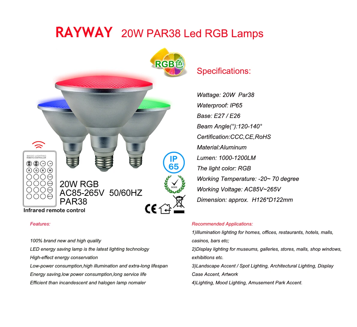 Светодиодный светильник RGB Par38, водонепроницаемый, 20 Вт, с дистанционным управлением