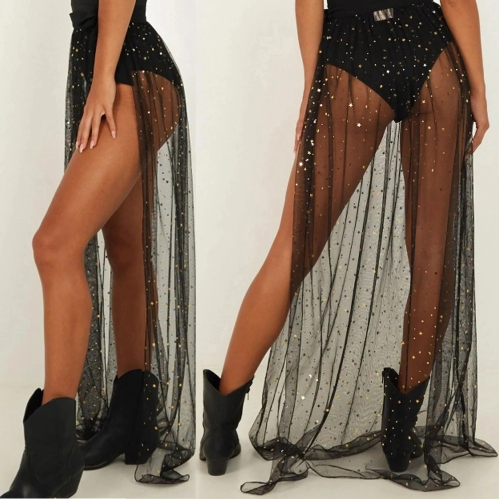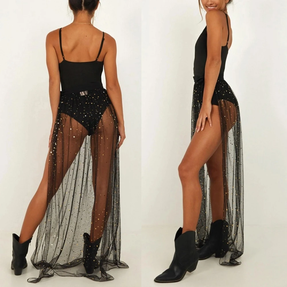 Женская сексуальная блестящая накидка на бикини с блестками, купальник, Новинка лета 2019, Женская сетчатая Макси-юбка с эластичным поясом, саронг парео, пляжная одежда