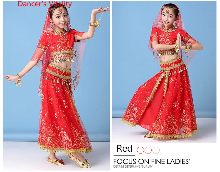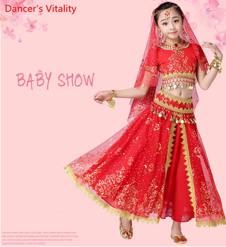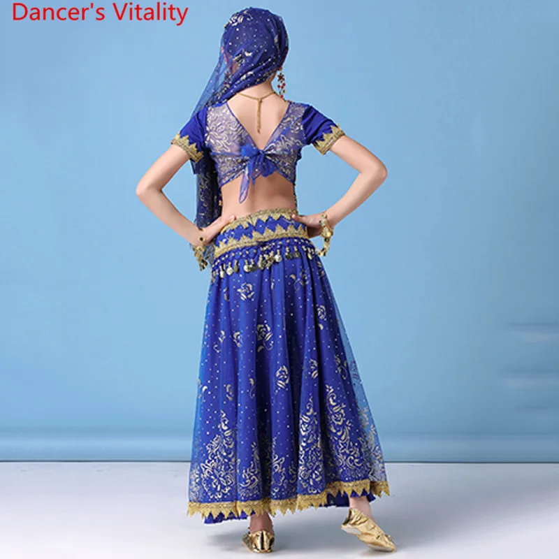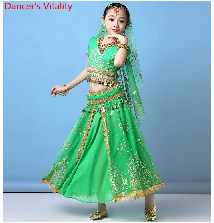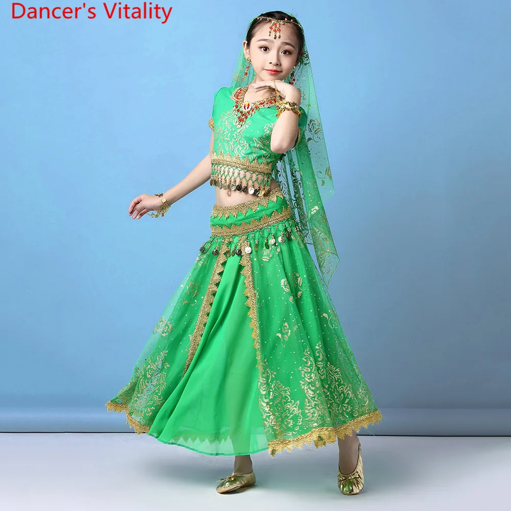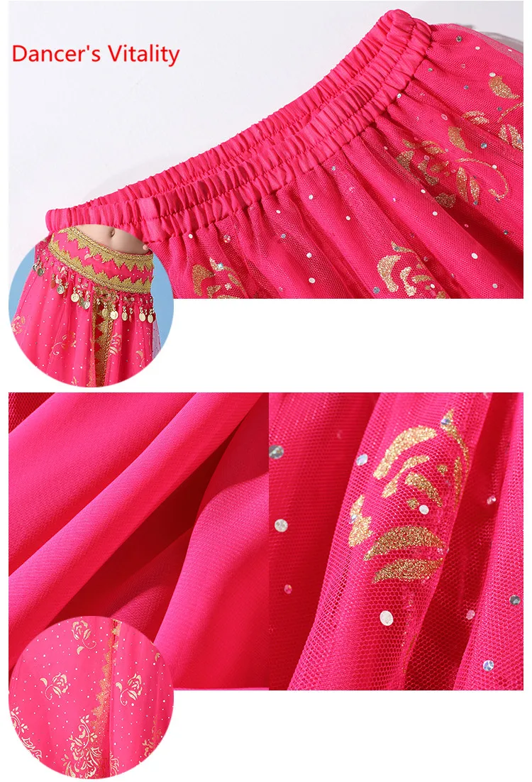 Индийская Одежда для танцев одежда для тренировок новый элегантный шифоновый топ для девочек, юбка с большим подолом комплект с ремнем для монет, сари, танцевальные костюмы для танца живота