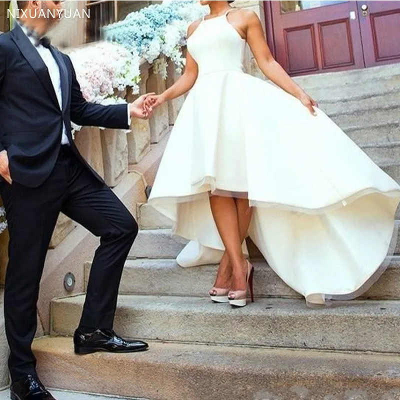 Платье Свадебное простое на бретелях-спагетти, Пляжное короткое, с высокой талией, Белыйцвет слоновой кости, с длинной спиной, 2021