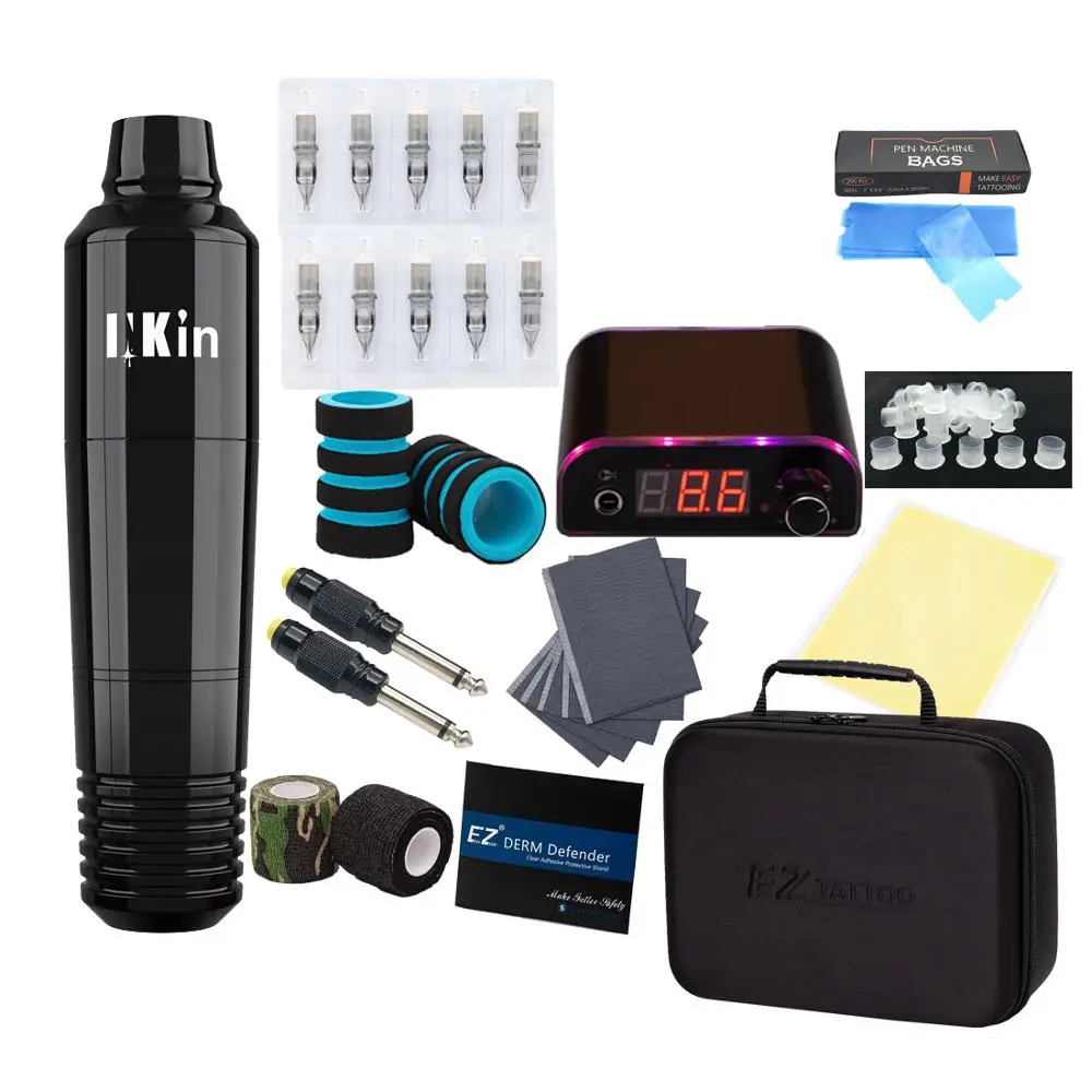 Пакет включает как показано ниже: Татуировочная машина EZ INKin Pen: 1 шт. EZ мини тату Источник питания: 1 шт. Чашки с чернилами 10 мм: 50 шт Защитные накладки из пены с эффектом памяти EZ: 2 шт. Кожа: 15*10 см: 1 шт. Крышка ручки: 200 шт Защитная пленка EZ Derm: 5 листов Чехол для повязки: 2 шт. Патроны EZ Revolution: 10 шт. Чистящие салфетки: 5 шт Беспроводная ножная педаль: 2 шт. Упаковочная коробка: черный чехол EZ