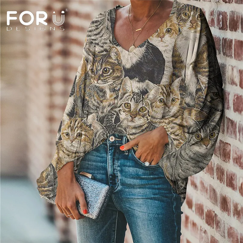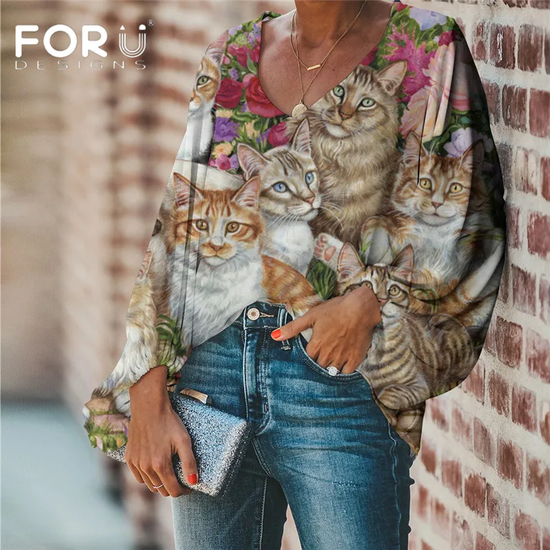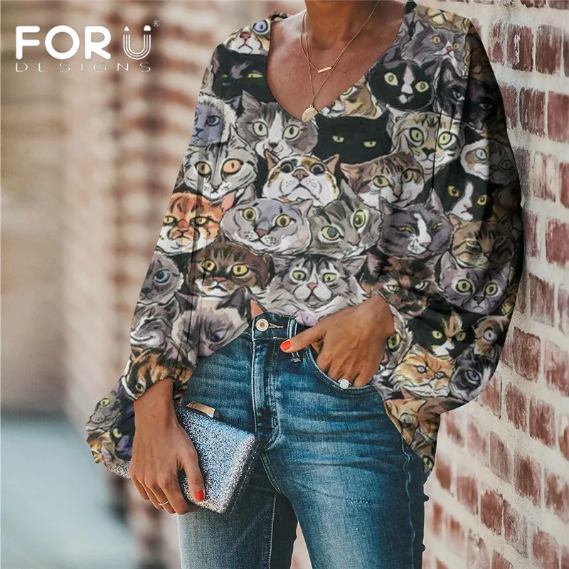 FORUDESIGNS, блузка большого размера, милая блузка с принтом кота М...