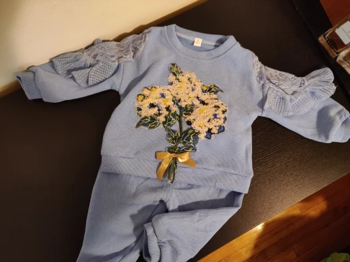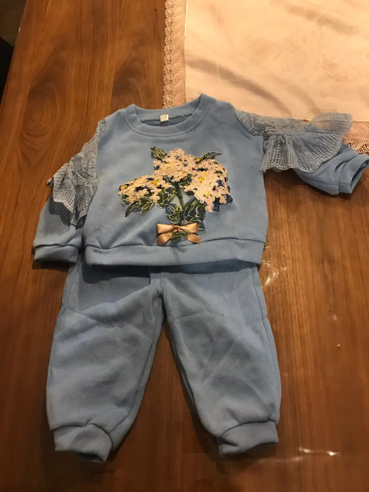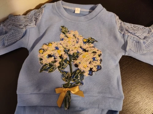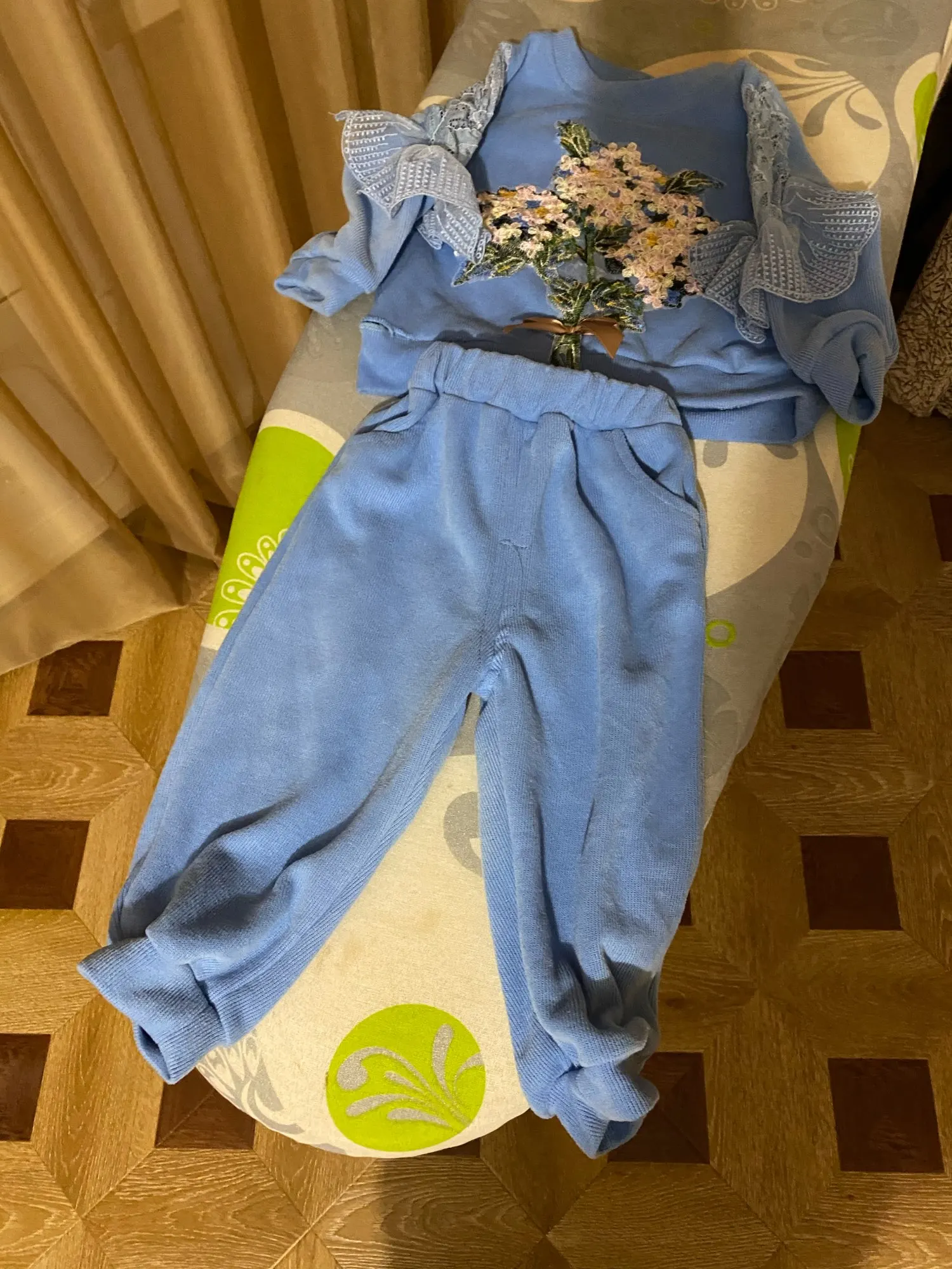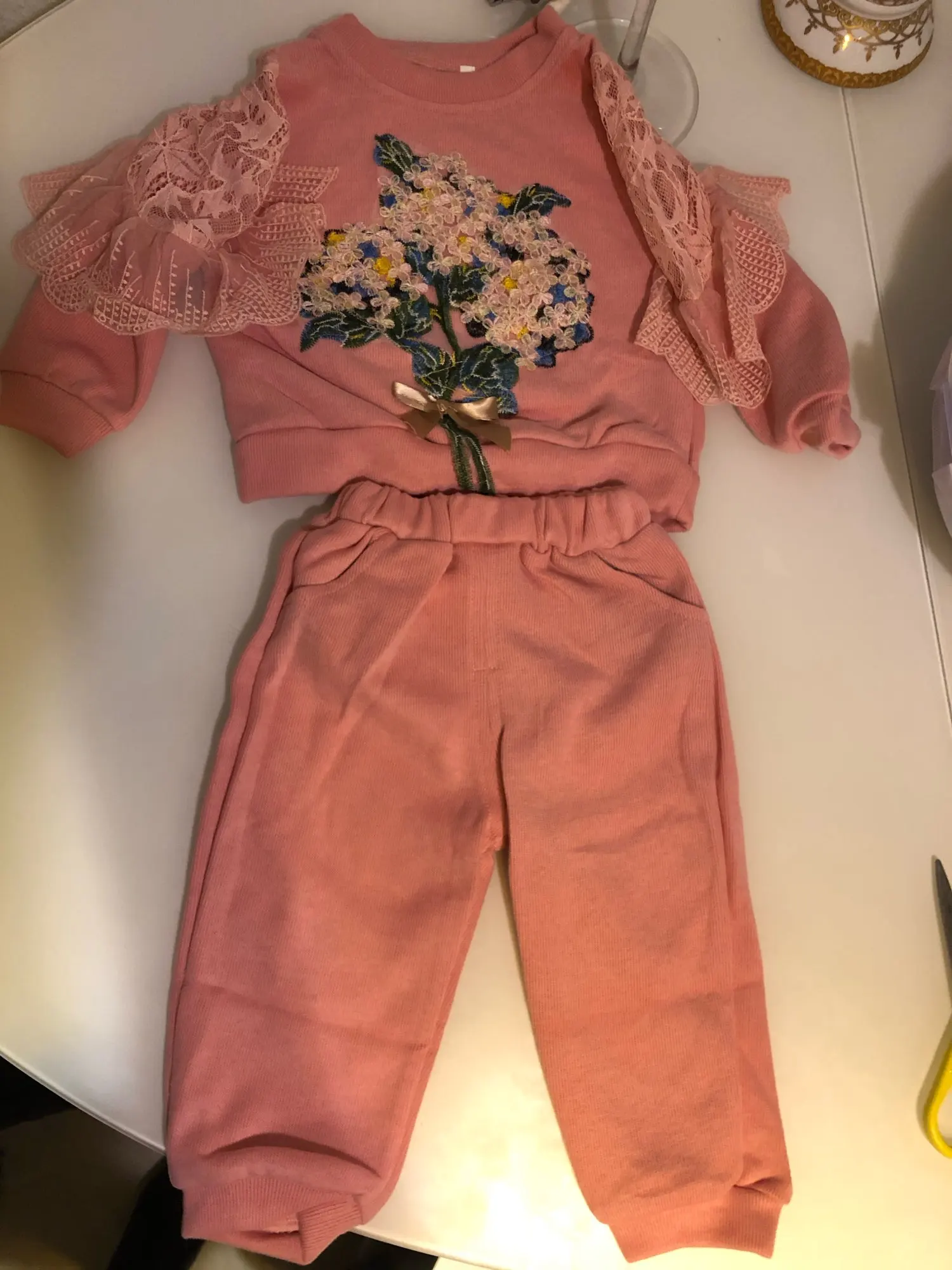 Хороший костюмчик, один-в-один как на фото, приятная ткань, цвет очень нежный, только цветы на свитшоте - не вышивка, а аппликация (пришили кусок сетки, на которой вышит букет), и карманы на штанах - обманка (специально вывернула один на фото). Пришел супер быстро, за 11 дней. Без брака, без запаха. Продавец - молодец