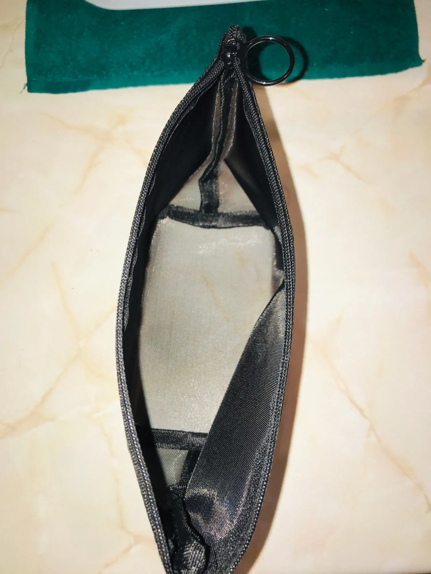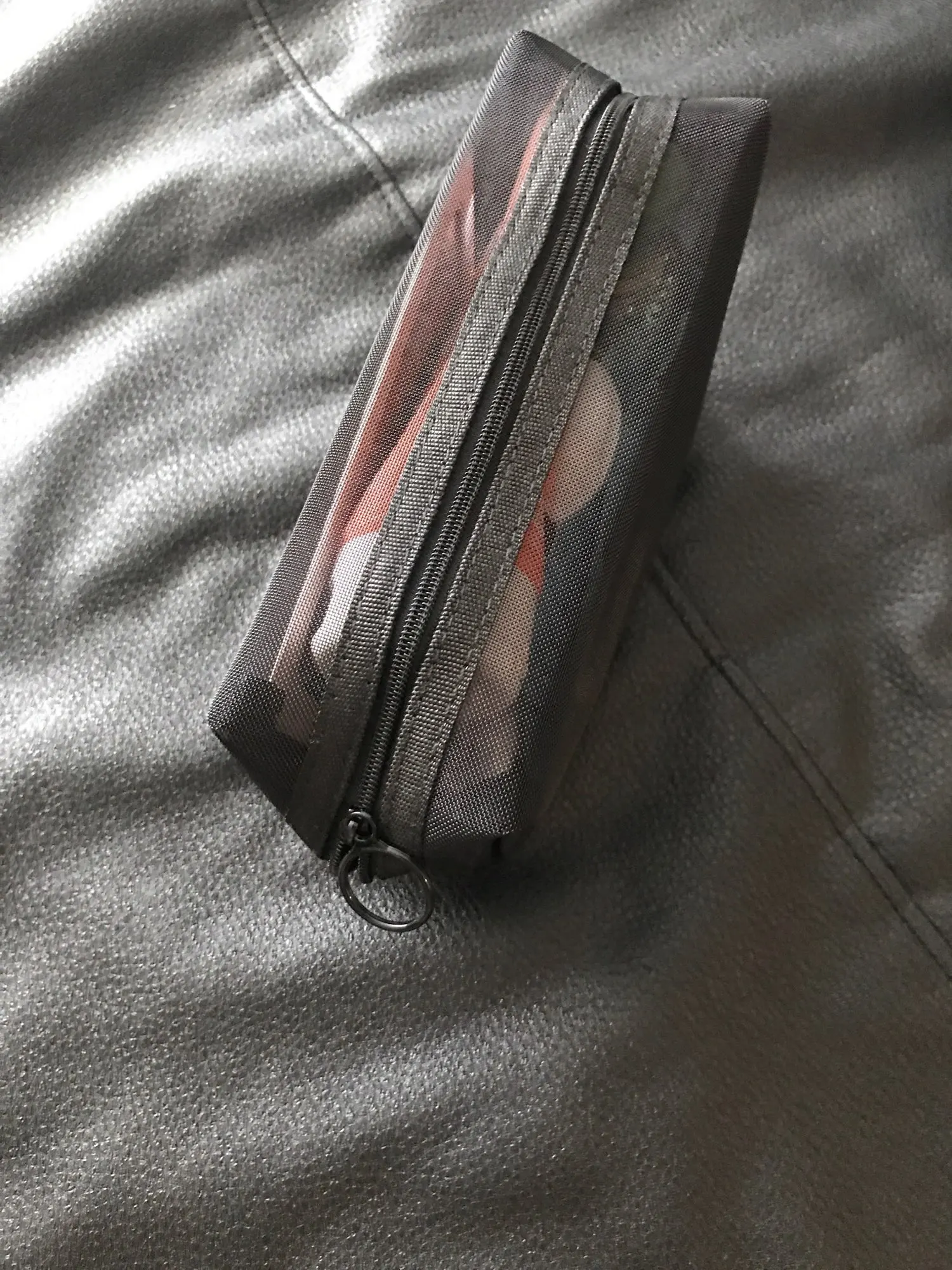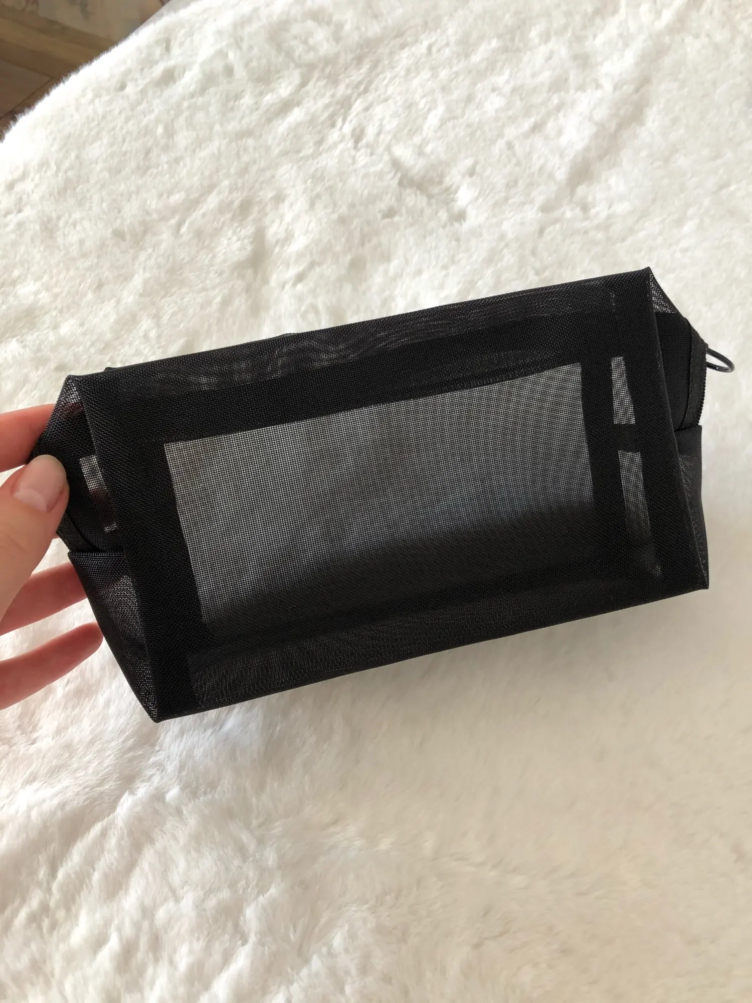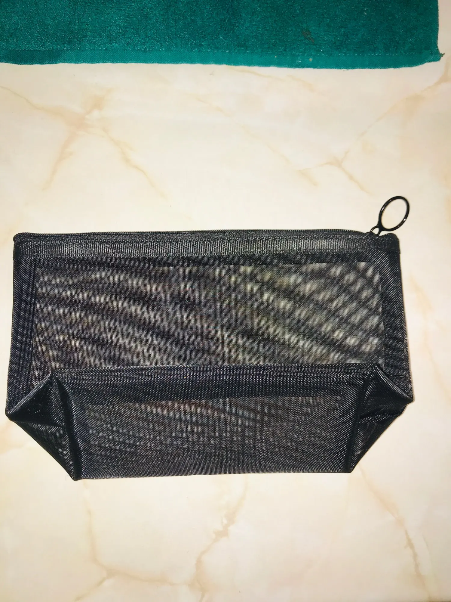 Пришла быстро, за 3 недели до Урала, в общей посылке с другими заказами. Полупрозрачная косметичка, ткань сетка жёсткая, прошито хорошо.