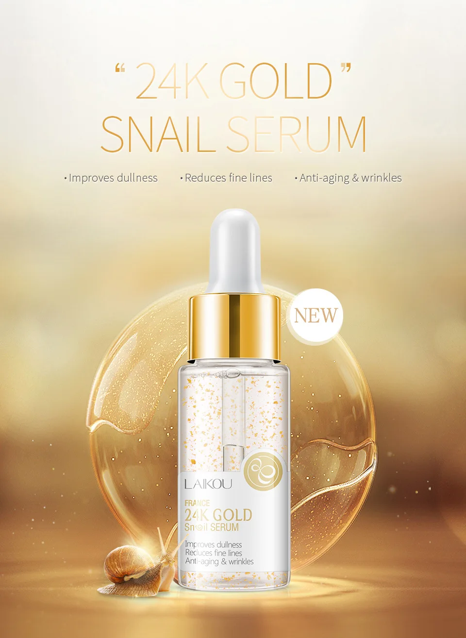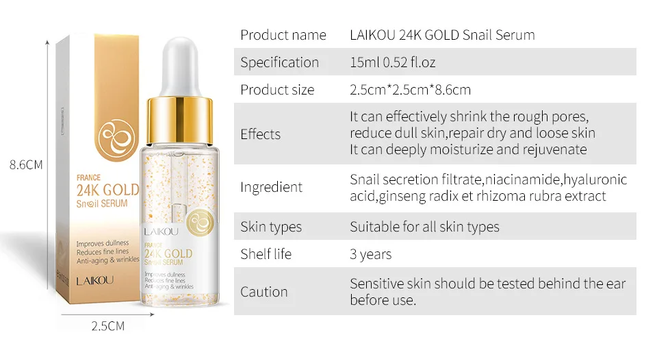 Название продукта LAIKOU 24K GOLD Snal Sreum Spelication:15ml0.52 fLo2 siae продукта: 25 см2 5 см 880 м Efects: он может эффективно потускнеть поры, уменьшить тусклый skinrepairdry и loo5e кожи он может глубоко увлажнить и омолодить ингредиент: улитка секция ftrateniacd namide гиалуроновая axid giseng radix et rhizoma rubra eitract типы кожи: Sutable для типов al shin полка lle:3 года внимание: чувствительная кожа должна быть протестирована за better Ear use.