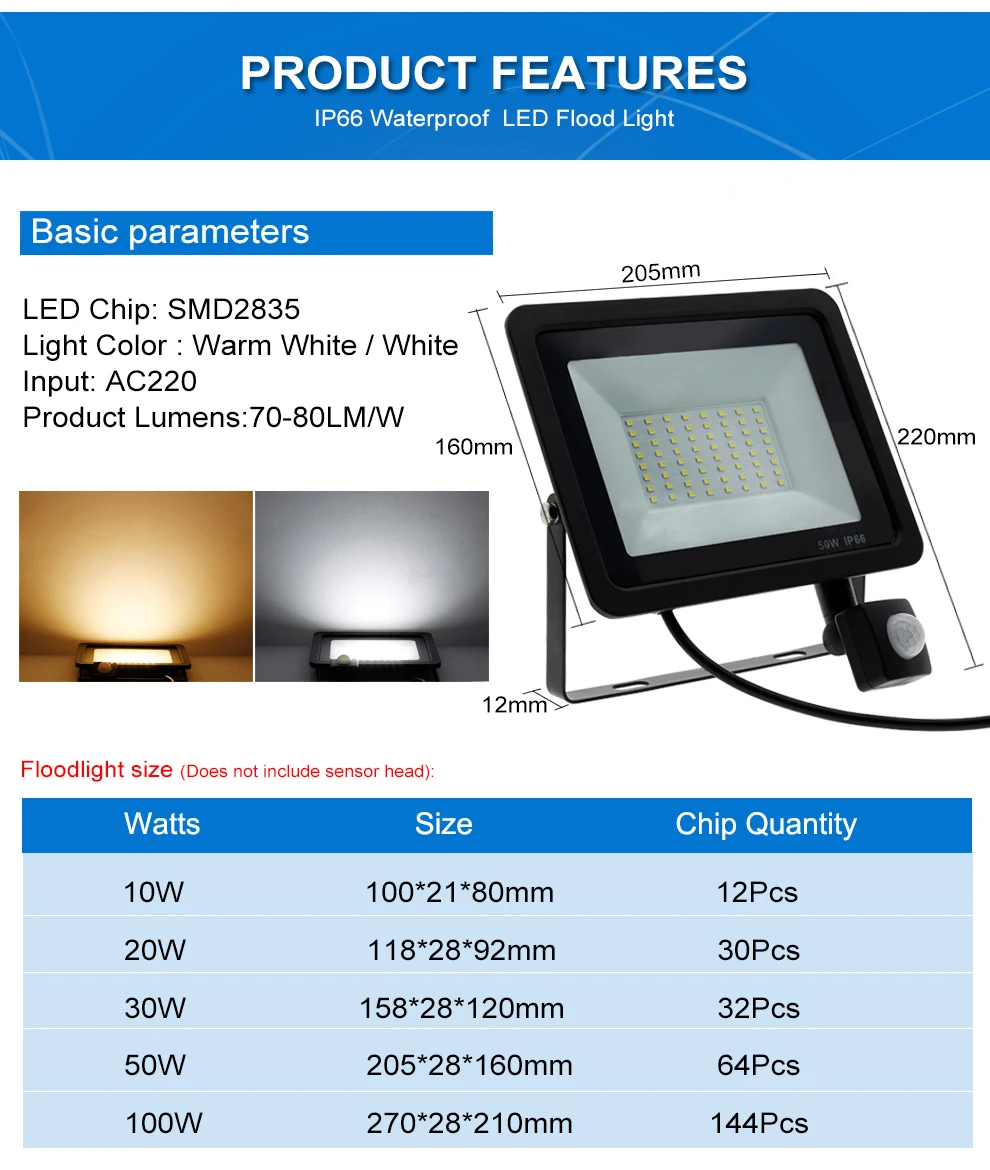 220 В светодиодный светильник PIR датчик движения отражатель светодиодный светильник водонепроницаемый IP66 Точечный светильник наружное настенное освещение светильник ing белый теплый белый