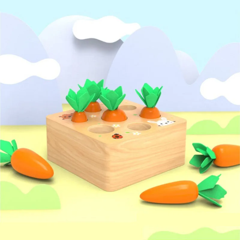 Сортировка игры:Вашему ребенку нужно будет распознать Размер моркови, чтобы положить их обратно в прорезь.