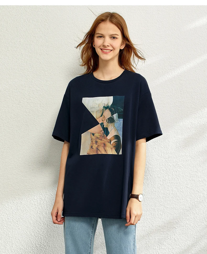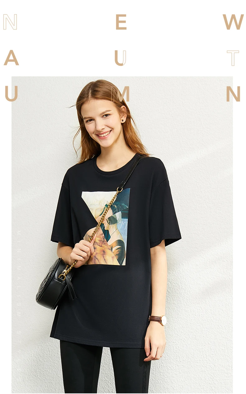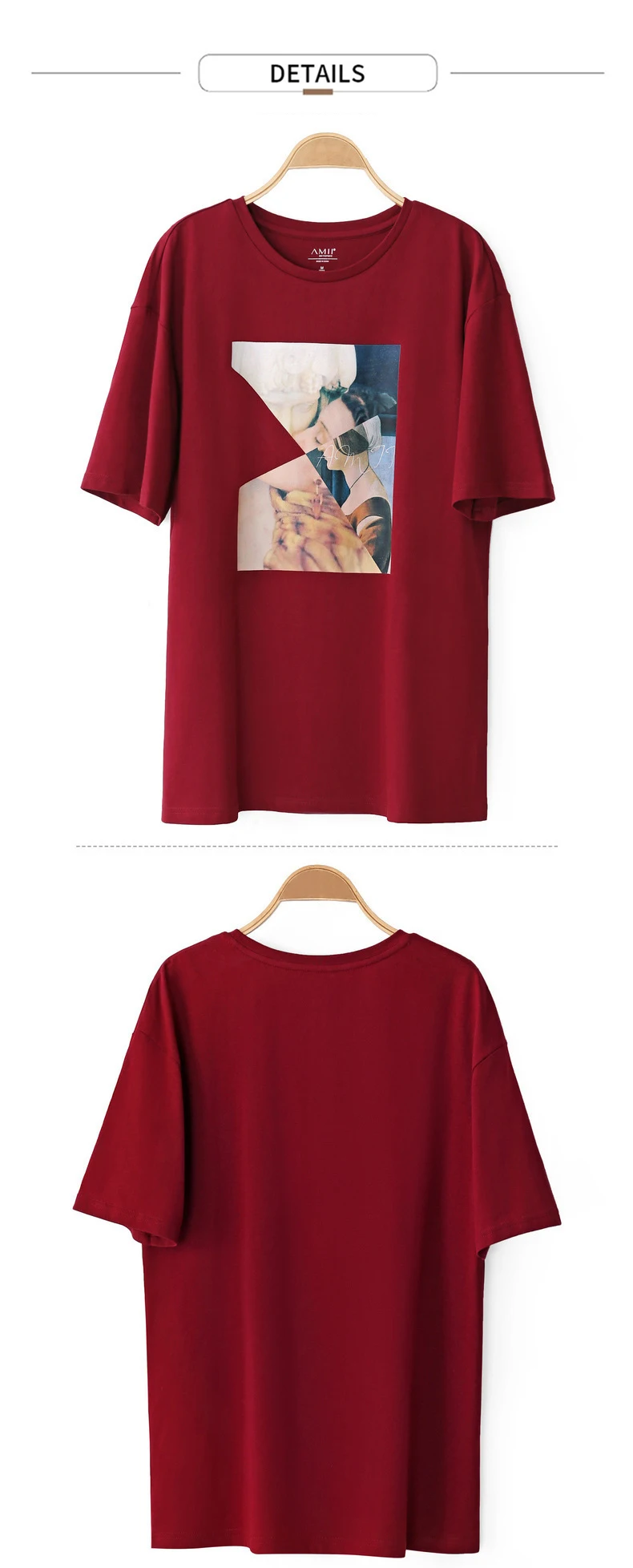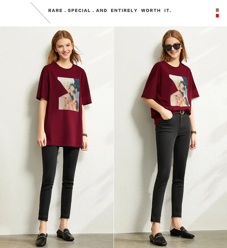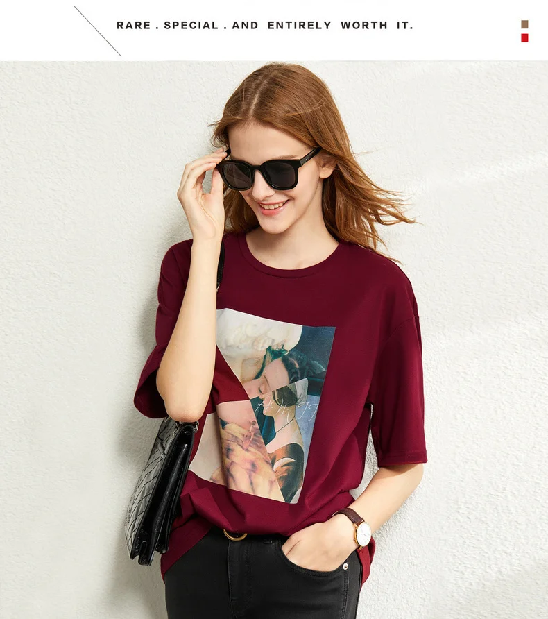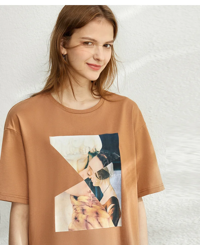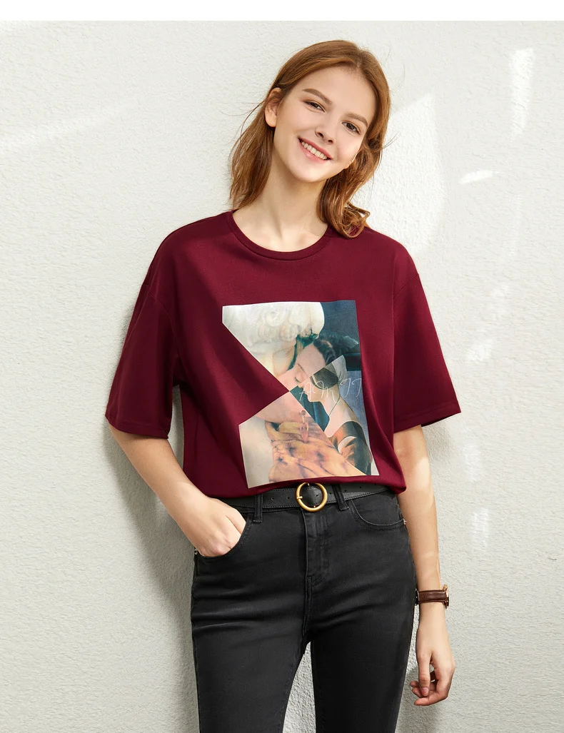 Футболка женская хлопковая, с круглым вырезом и принтом, лето 12020007