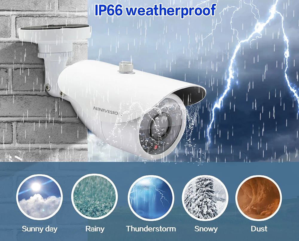 Используйте их в качестве наружных камер или внутренних камер, так как они построены жестко, чтобы выдерживать любую погоду: дождь, снег, пыль и жаркие дни. С защитой от атмосферных воздействий IP66 и кабелями, проходящими через подставку для дополнительной защиты, гарантируем, что вы сможете ответить на их производительность, день в день. Наша камера имеет сверхпрочный металлический корпус, профессиональный IP66, устойчивый к атмосферным воздействиям, обеспечивая стабильную производительность как внутри, так и снаружи.