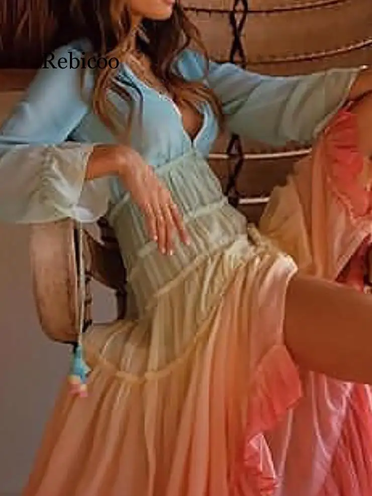 Женское осеннее платье Бохо с длинным рукавом, свободное платье с оборками, длинное пляжное платье градиентного цвета