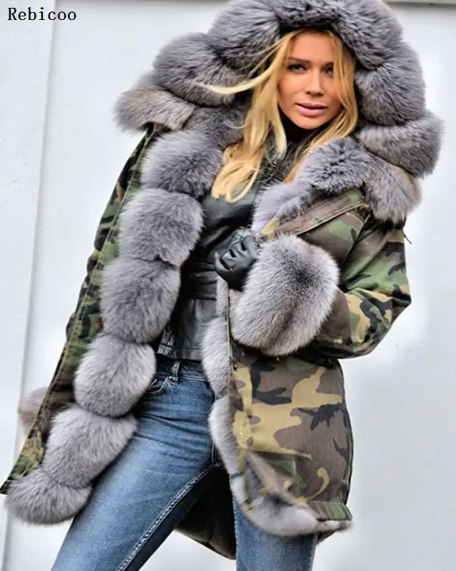 Женское зимнее пальто с большим шерстяным воротником и капюшоном