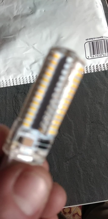 В этот раз я очень удивился, как выглядит лампочка. Вроде бы все то же самое, но нет привычной пластиковой оболочки. Лампочка полностью залита силиконом через низ цоколя. Горит хорошо и не греется. Это самое главное. Можно брать.