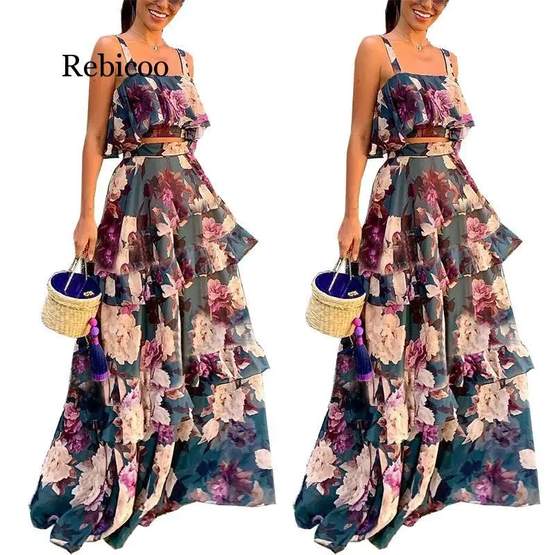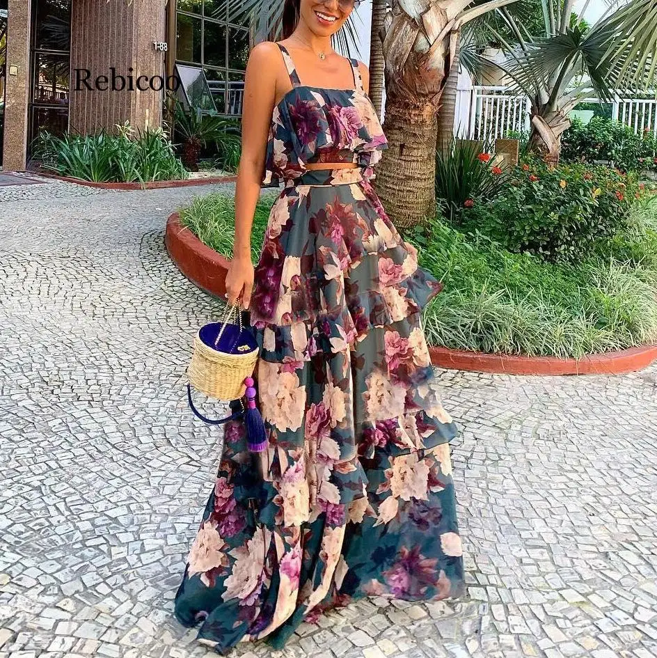 Женский шифоновый комплект из двух предметов, укороченный топ и длинная юбка, бандо с цветочным принтом и оборками, повседневный костюм в стиле бохо с высокой талией