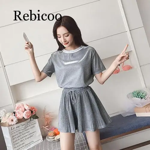Милый Летний комплект из двух предметов, модная женская зеленая свободная футболка с коротким рукавом + плиссированные широкие шорты