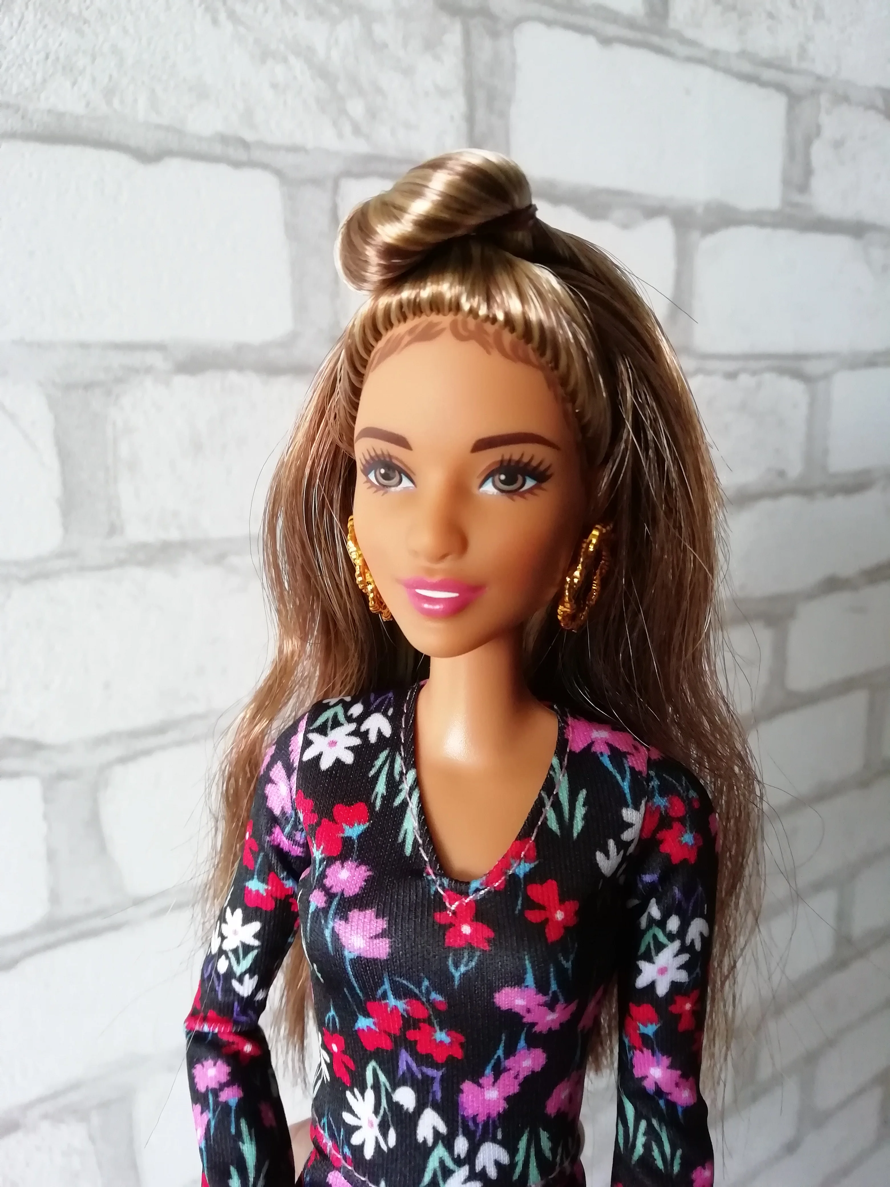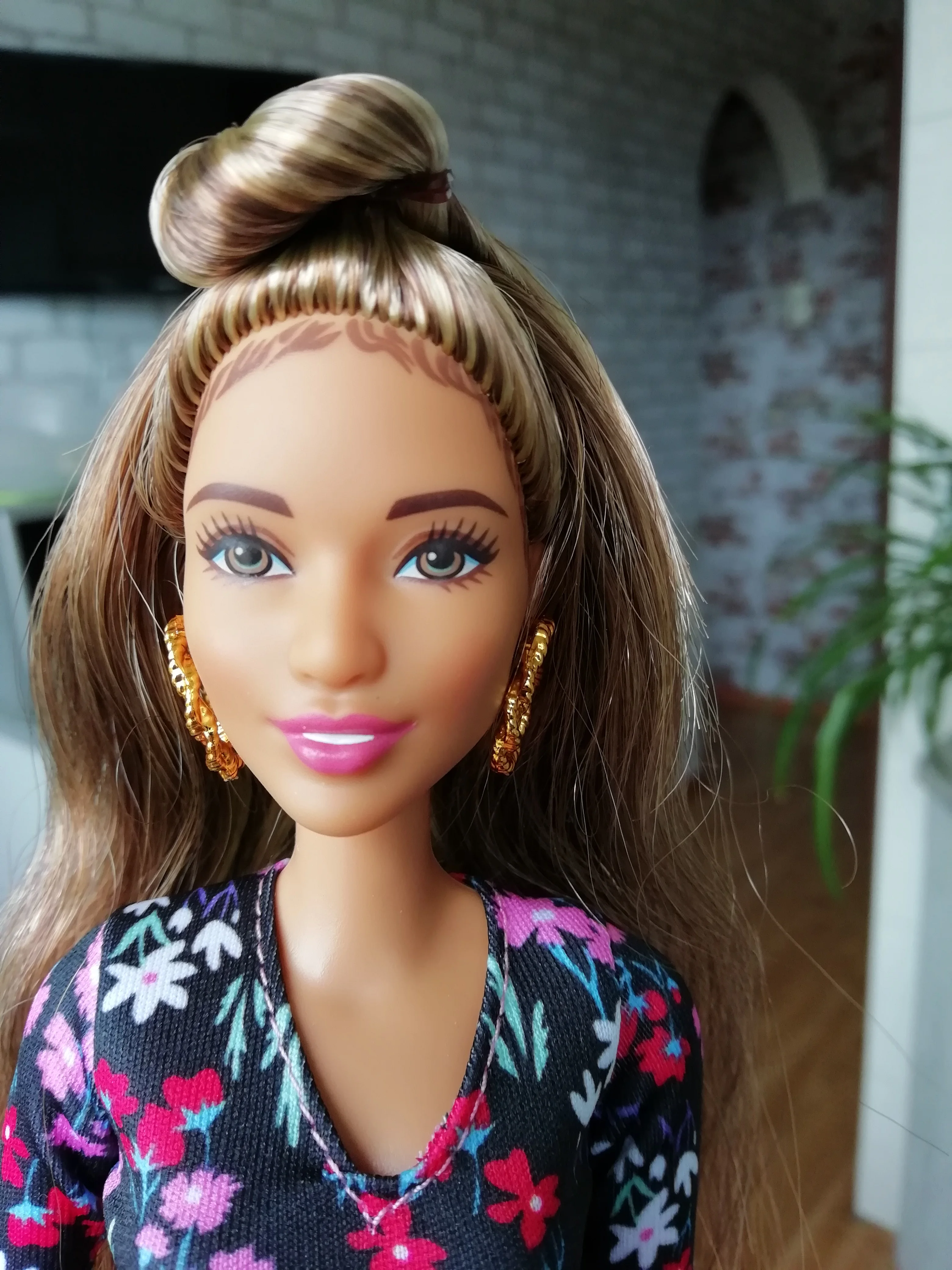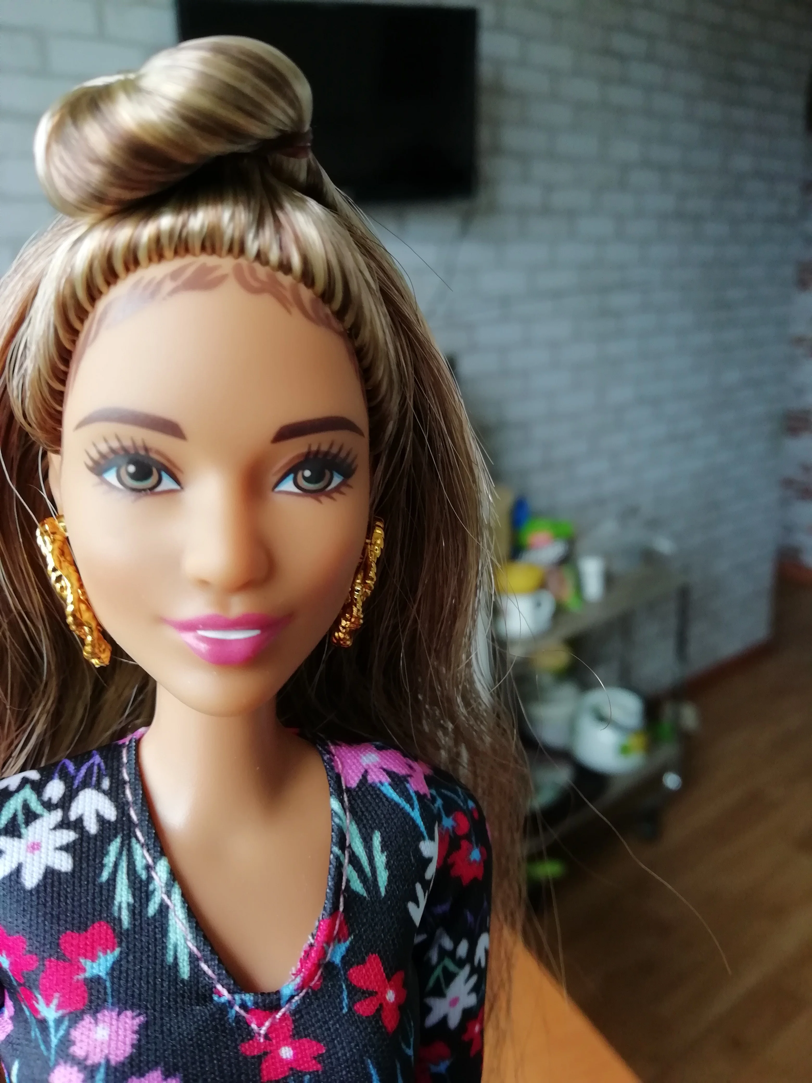 Давно присматривалась к кукле, рада, что купила. Красивая загорелая брюнетка с пышными формами, молд Джойс. Пришла без коробки, но одежда и аксессуары все на месте. Макияж не идеальный, но в общем вполне приемлемый. Буду пересаживать на йогу с пучком.