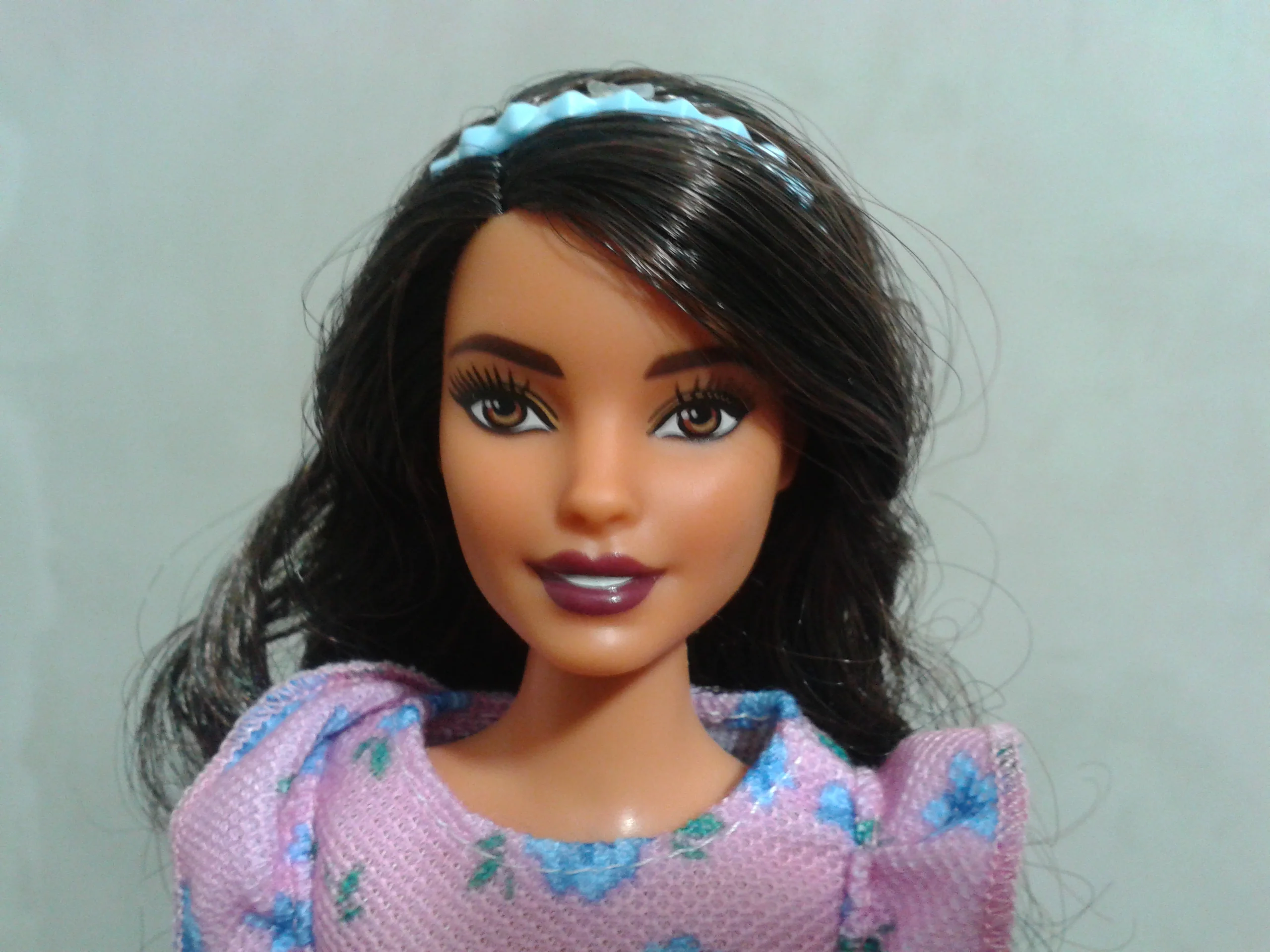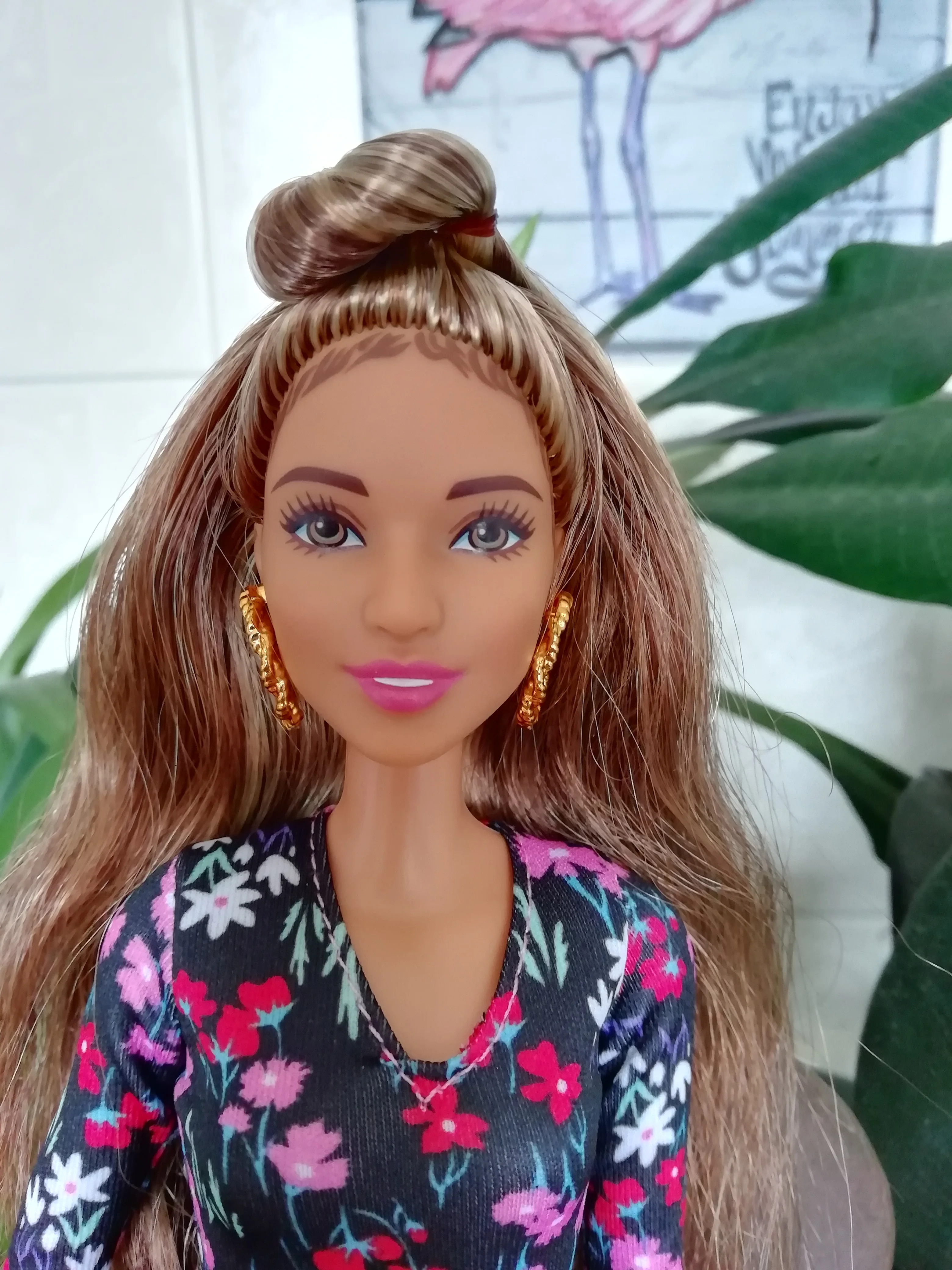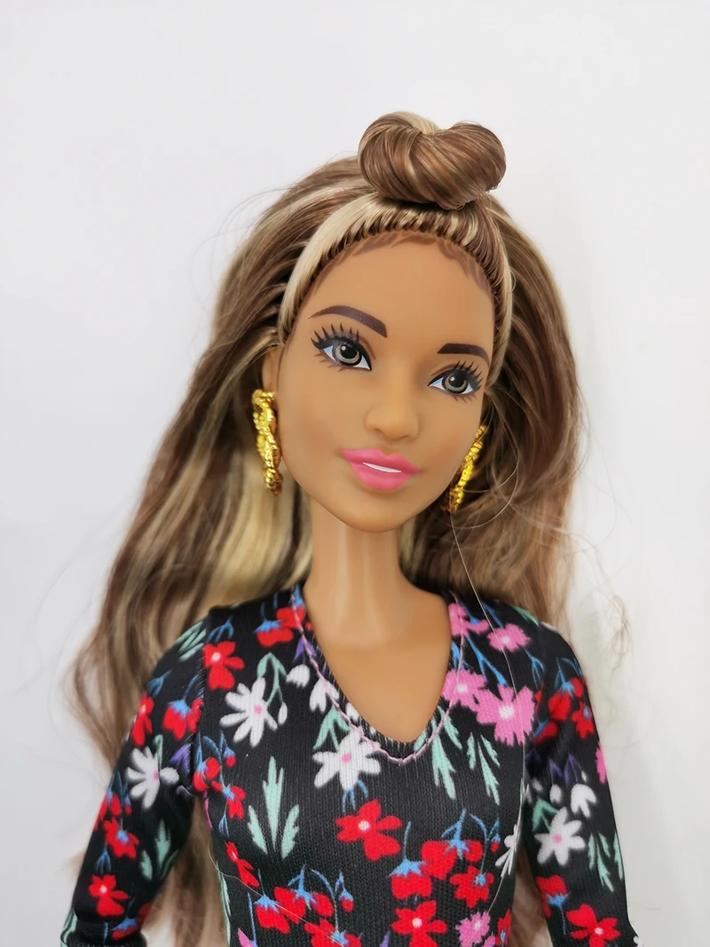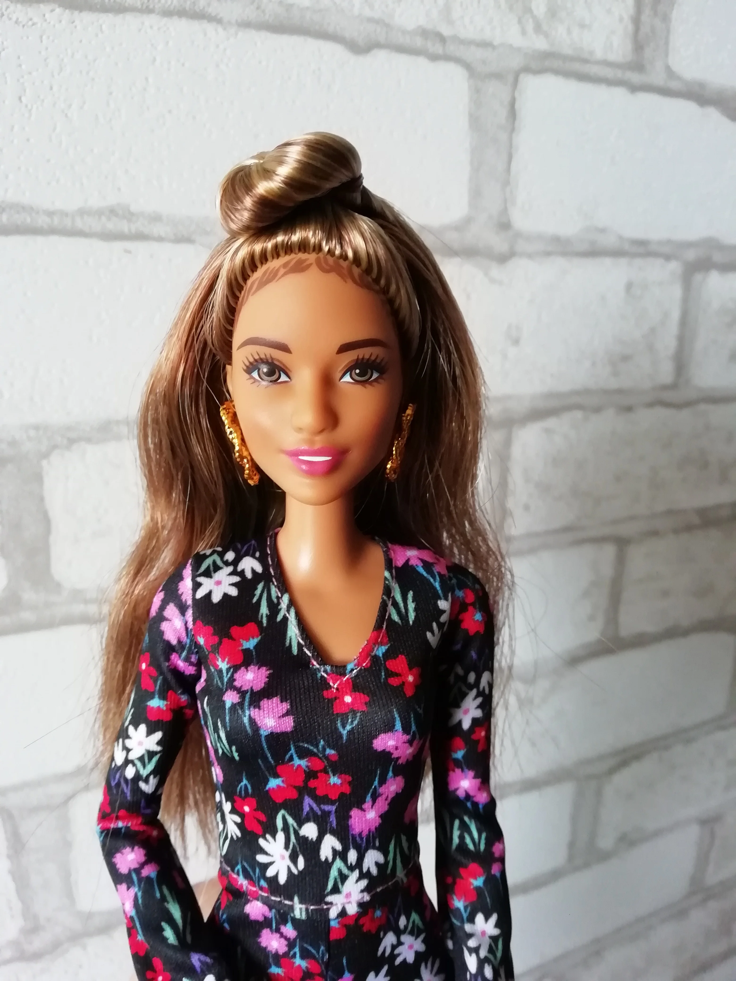 Давно присматривалась к кукле, рада, что купила. Красивая загорелая брюнетка с пышными формами, молд Джойс. Пришла без коробки, но одежда и аксессуары все на месте. Макияж не идеальный, но в общем вполне приемлемый. Буду пересаживать на йогу с пучком.