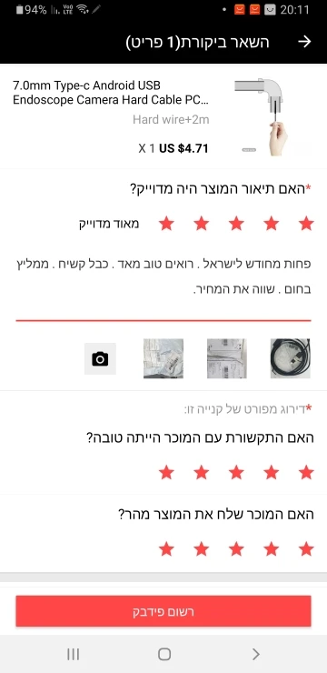 Эндоскоп получил через 24 дня после заказа. Проверил: всё отлично работает, но через другую программу AN98 из плеймаркета. Картинка чёткая, освещение регулируется. Продавец молодец, отправил товар сразу. Качество товара отличное. Рекомендую товар и продавца.