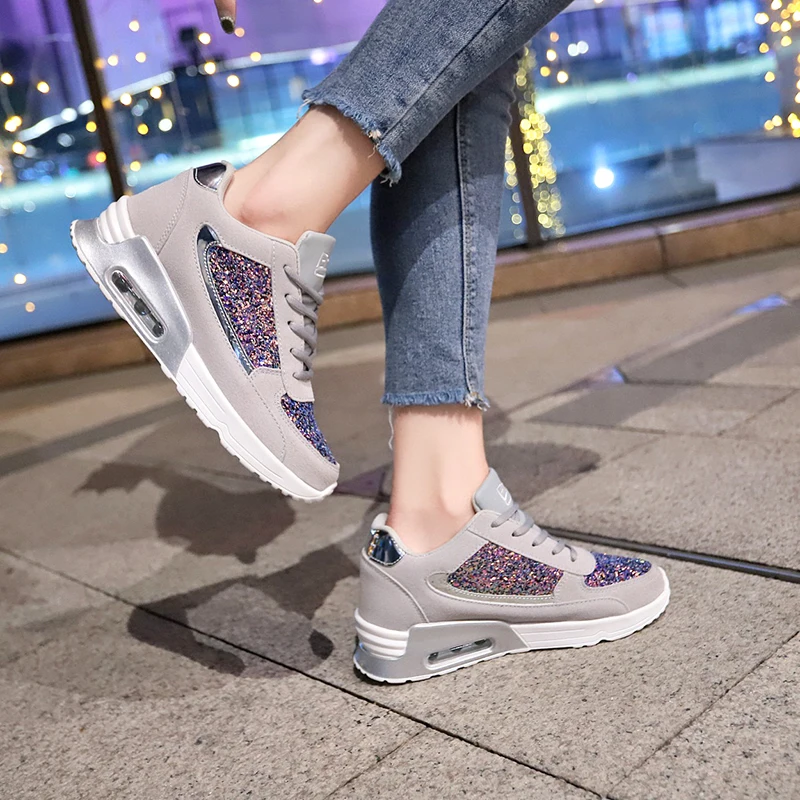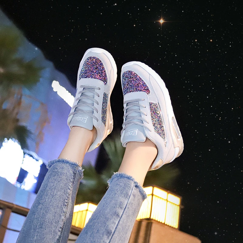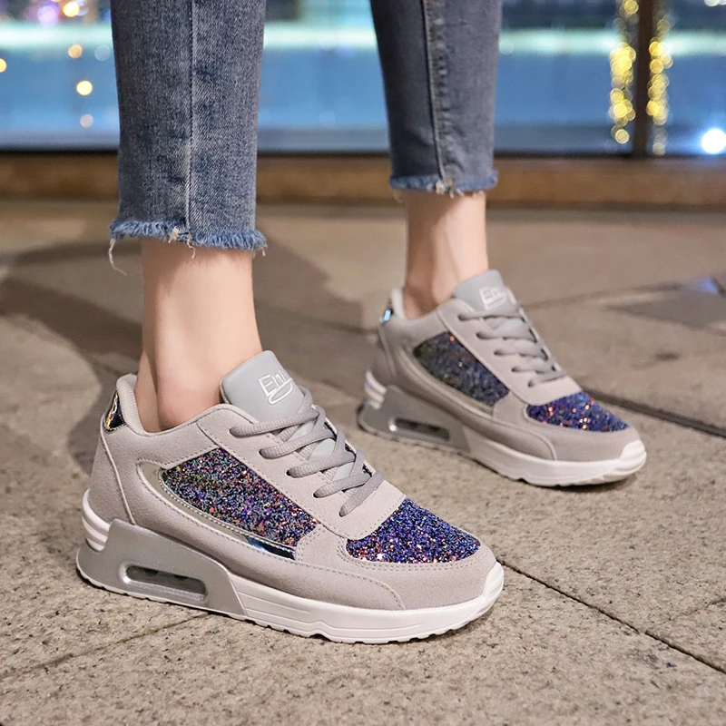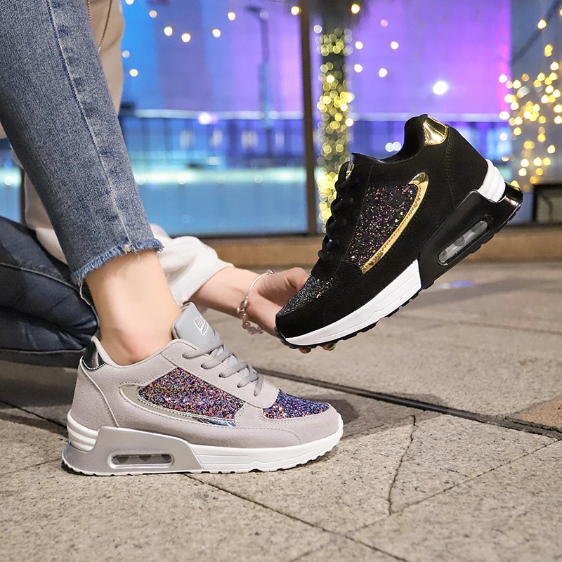 Женские кроссовки на танкетке, с блестками, модная спортивная обувь для девочек, женские кроссовки, черная обувь, 2020