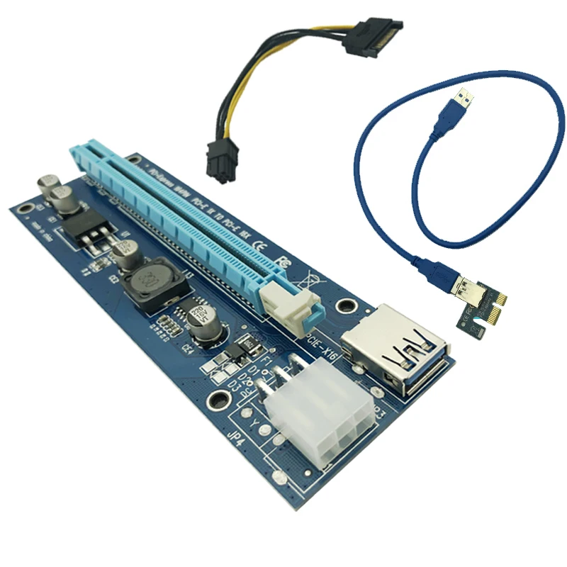 6pin Особенности:1. 100% новый и высокое качество.2. Использование кабеля USB 3,0 длиной 60 см в качестве удлинителя, высокое качество и супер скорость.3. С 4х FP твердотельными конденсаторами, что делает Графический источник питания более стабильным и безопасным.4. С SATA 15pin штекером до 6pin кабель питания, более мощный, и уменьшить нагрузку материнской платы.5. Позолоченные контакты для лучшего подключения и длительного срока службы.6. Совместим с разъемом 1х, 4x,8x,16x PCI-E материнской платы.7. С боковым зажимом для крепления другой карты.8. Драйвер не нужен.9. Предназначен для майнинга биткойнов.10. Размеры: approx.12.8cm * 4,2 см * 1,0 см/5,03*1,65*0,39''11. Цвет: синий