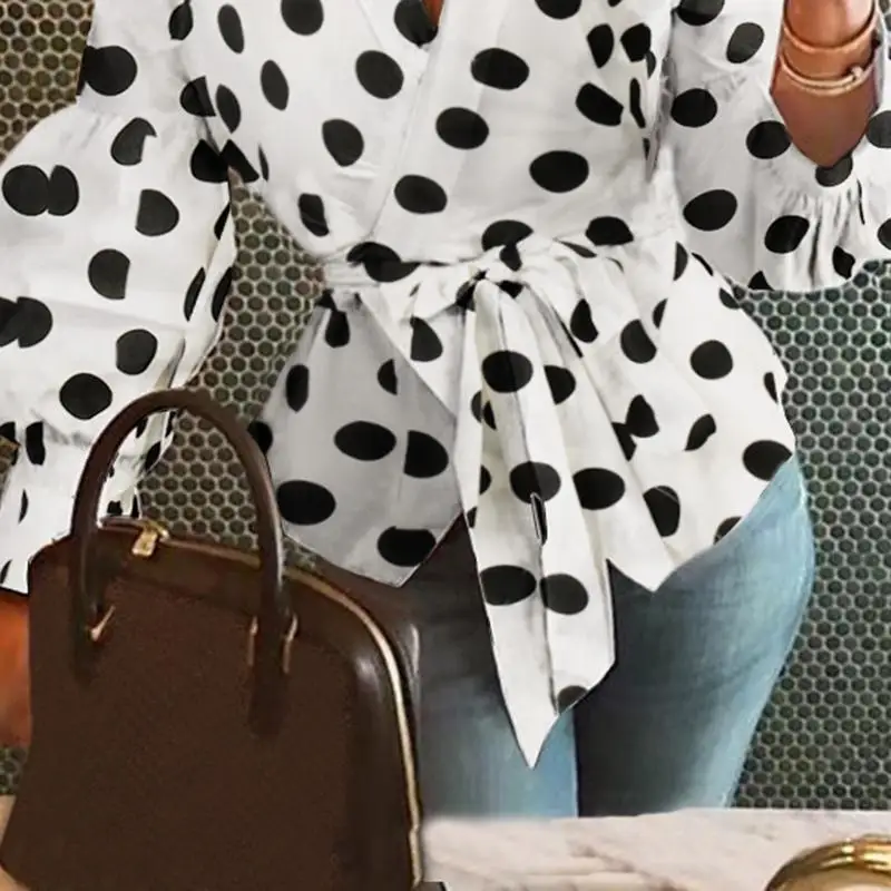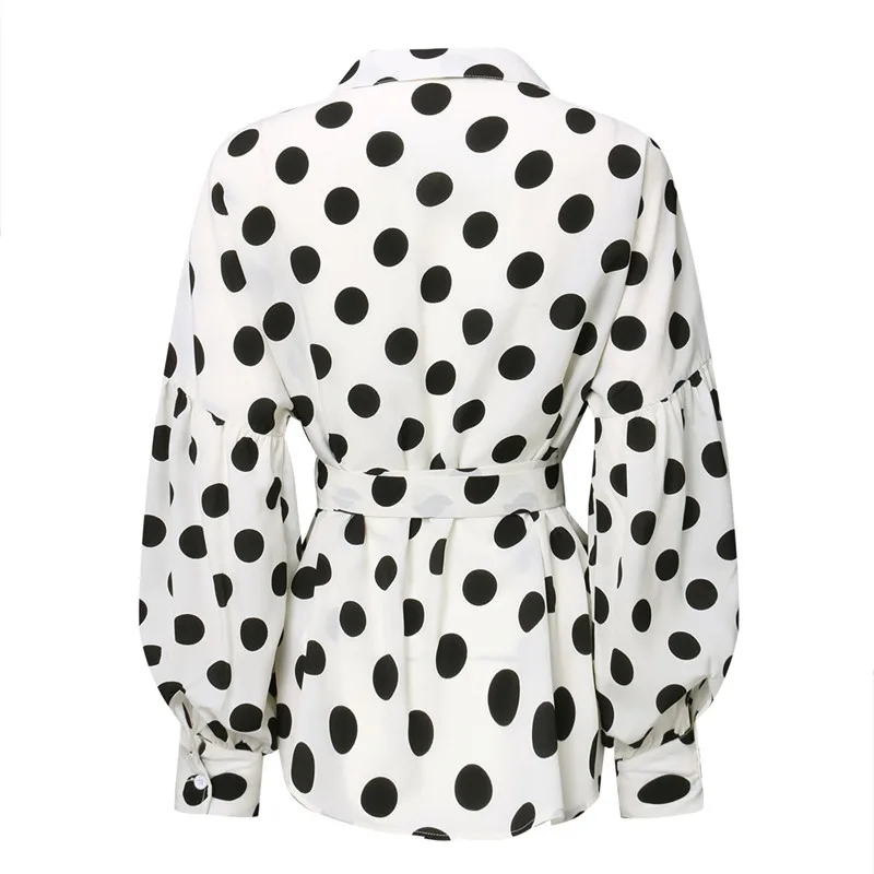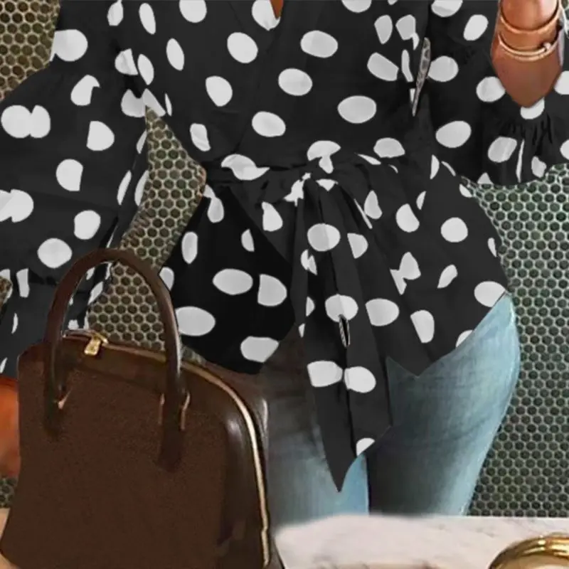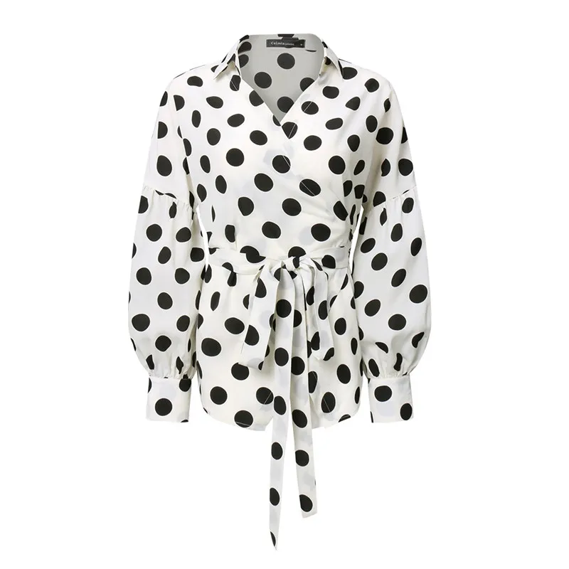 Блузка Celmia женская с V-образным вырезом, пикантная элегантная вечерняя рубашка в горошек, повседневная свободная туника с поясом и рукавами-фонариками, осень 2021