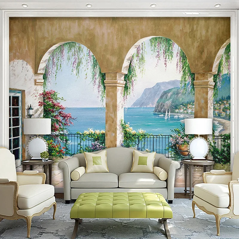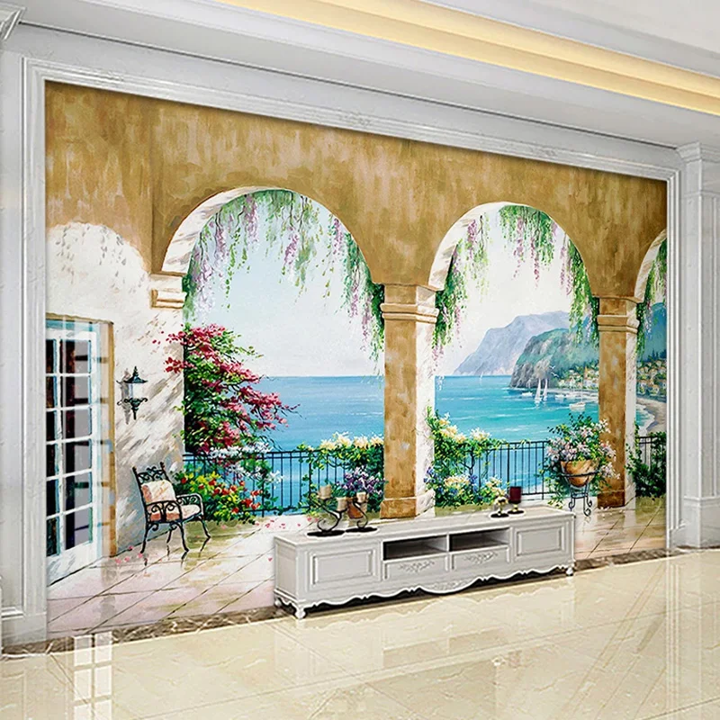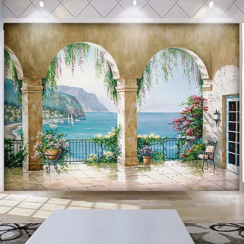 Пользовательские 3D обои в европейском стиле, картина маслом, морской пейзаж, балкон, фотообои, гостиная, спальня, фон для декора стен, фрески