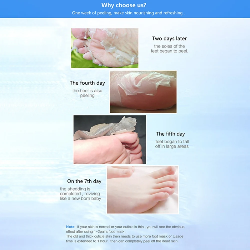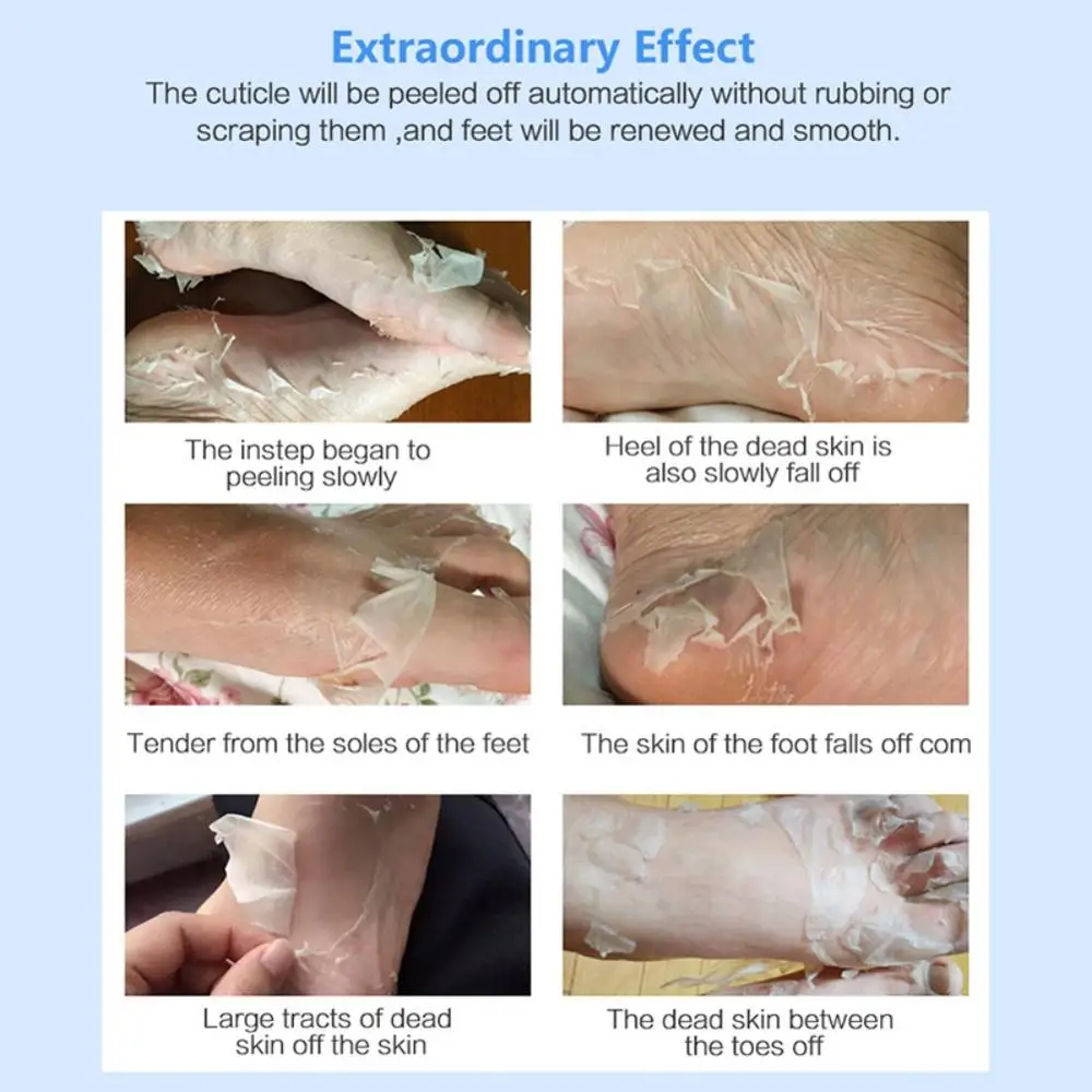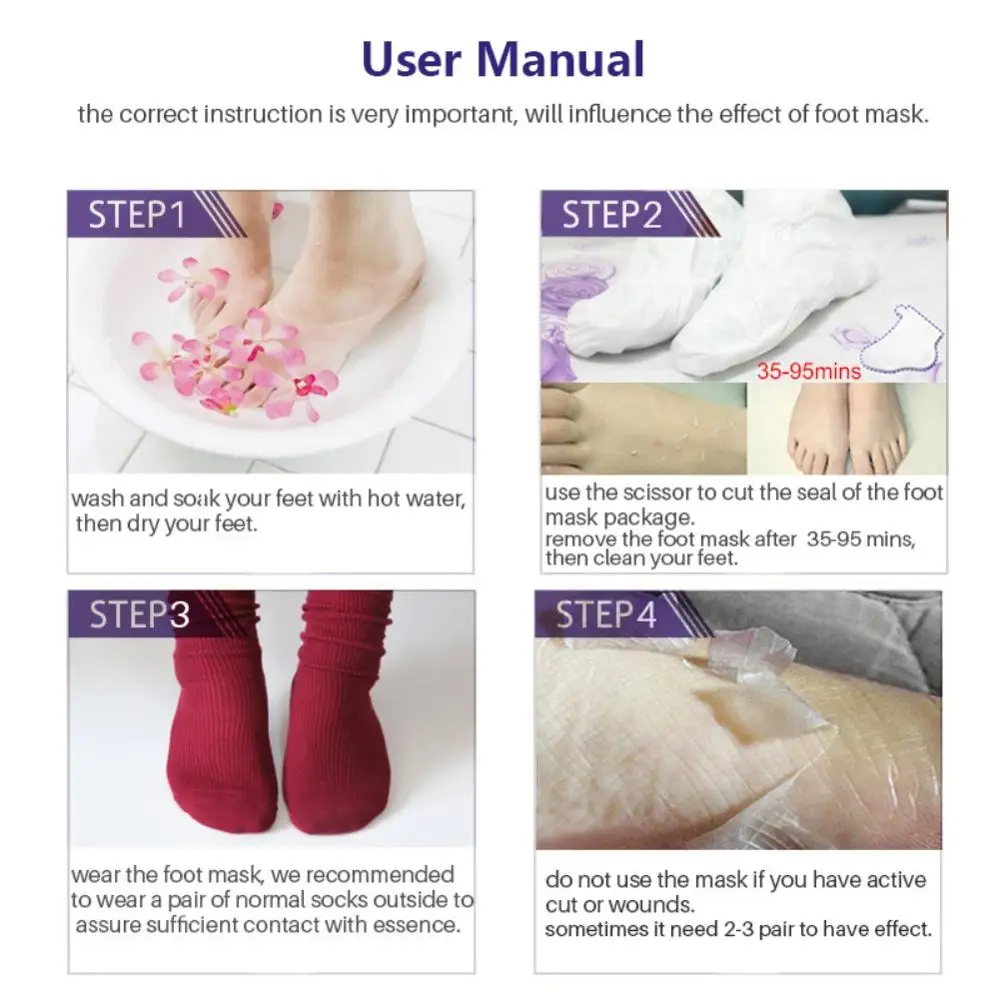 Характеристики: Тип: маска для ног Количество: 1 пара Вес нетто: 38 г Описание: 1. Мойте и наслаждайтесь ногами горячей водой, а затем высушите ноги. 2. Используйте ножницы, чтобы запечатать посылка маски для ног. 3. Носите маску для ног, мы рекомендуем носить несколько нормальных носков снаружи, чтобы обеспечить достаточный контакт с эссенцией. 4. Снимите маску для ног через 35-95 минут, затем очистите ноги. 5. Большинство людей начинают очищать омертвевшую кожу после 48 часов использования, но из-за различных типов кожи, кому-то может потребоваться 2-3 пары, пожалуйста, используйте маску для ног снова 48 часов позже. 6. Не используйте маску, если у вас есть активный срез или язвы. 7. Мы предлагаем вам наслаждаться использованием ваших ног горячей водой через 48 часов. Посылка включает в себя: 1 пара маски для ног