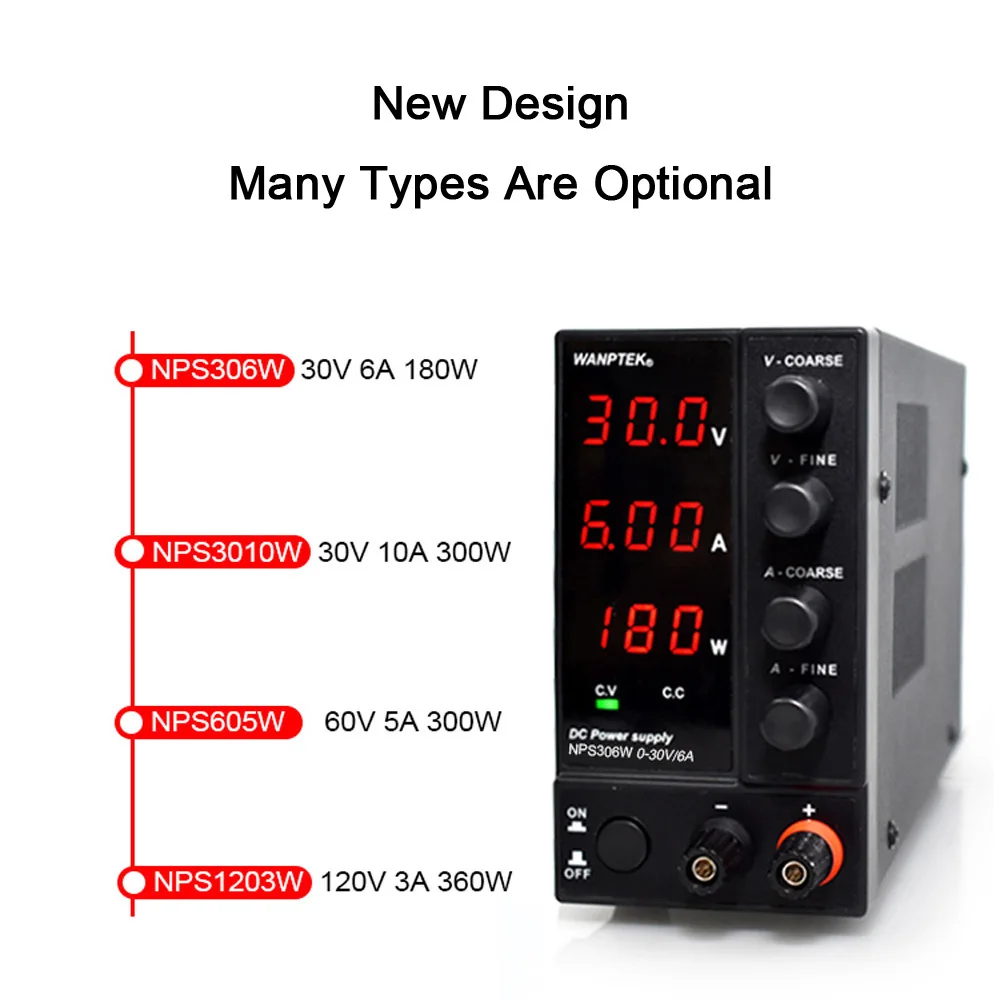 NPS306W/605W/3010W/1203W 4 цифровой дисплей Регулируемый источник питания постоянного тока мини лабораторное Переключение напряжения Регулируемая мощность NPS306W источник питания постоянного тока с дисплеем питания 30V6ANPS3010W источник питания постоянного тока с дисплеем питания 30V10ANPS605W источник питания постоянного тока с дисплеем питания 60V5ANPS1203W источник питания постоянного тока с дисплеем питания 120V3AХарактеристики продуктаНебольшой размер, легкий вес и высокая плотность мощности.Постоянное напряжение, постоянный ток автоматическое переключение.Напряжение, ток, мощность 3 окна дисплейТепловыделение вентилятора с контролем температуры, низкий уровень шума и долгий срок службыОбласть применения1. Тестирование производственной линии.2. Чехол для мобильного телефона, компьютера, техническое обслуживание электрооборудования.3. Старение продукта, покрытие.4. Заряжайте аккумулятор.5. Лаборатория, исследования и обучение.6. Все остальное требует постоянного тока регулируемого источника питания.Модель изделияУпаковочный лист:1 x источник питания постоянного токаРуководство пользователя (1 шт.)1 x тестовая линейка1 х линии электропередачи (EU/AU/US)