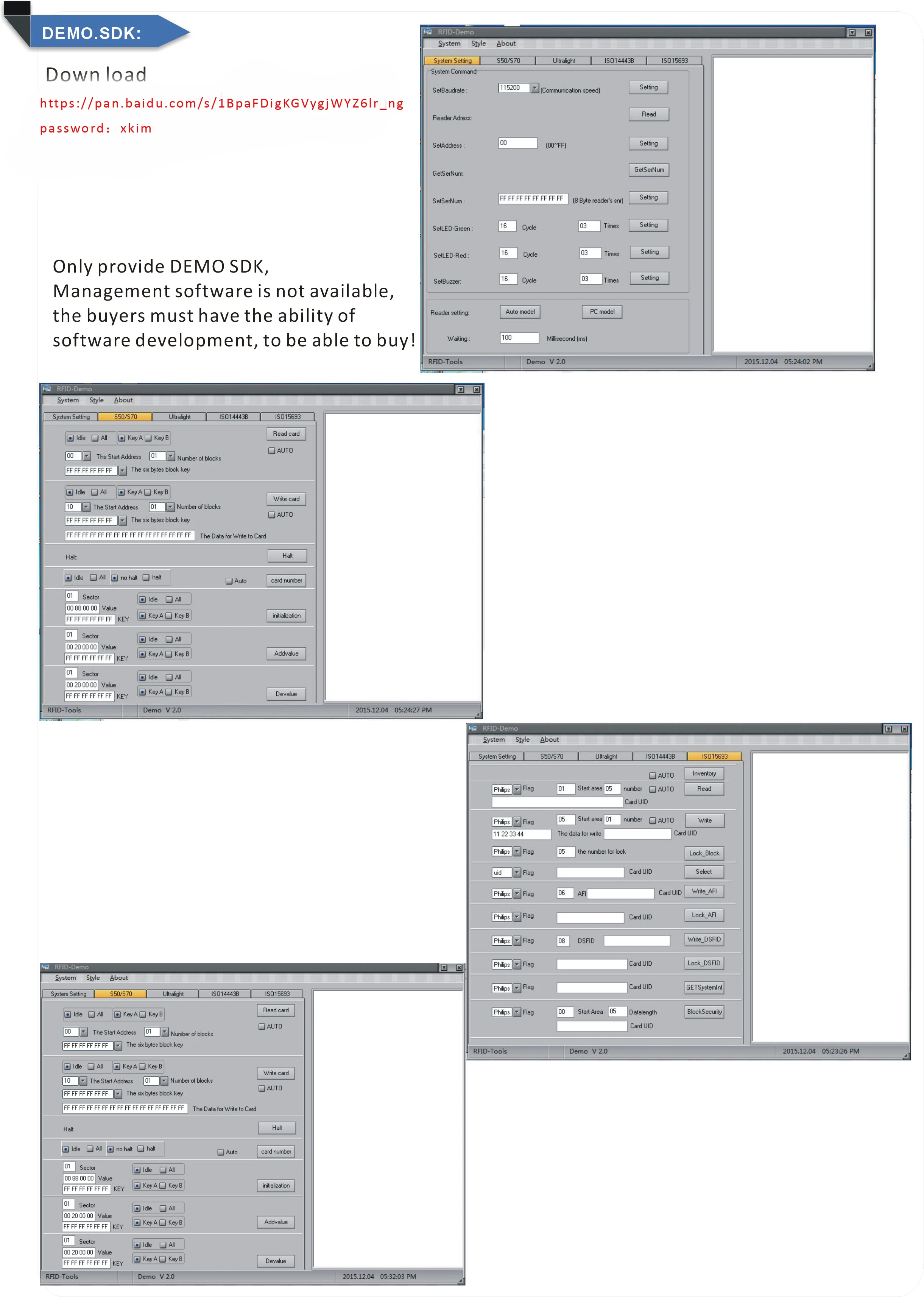 100% brand new and high quality Led and beeper are controlled by API Only support Windows opreation system Program language: Specification: Frequency: 13.56 MHz Protocol: ISO14443 Type A Support Card: MF1 50 & S - S - 70 / U - ltralight The System Support: Windows 8.1, Windows XP, Windows 7, Windows 8, Windows 8.1 The Read/Write Speed: < 100 ms Reading short: up to 60 mm (depends on the card/tag type) Interface: USB Baud Rate: 4800-115200 BPS Indicator: Two leds (software controlled) Buzzer: Built - in (software controlled) Power Supply: DC 5 v Operating Temperature: 0 ° to 60 ° C C Storage Temperature: 25 ° C to 80 ° C Relative Humidity: up to 90%