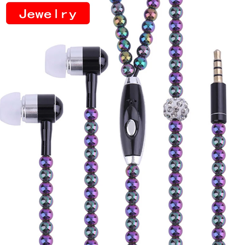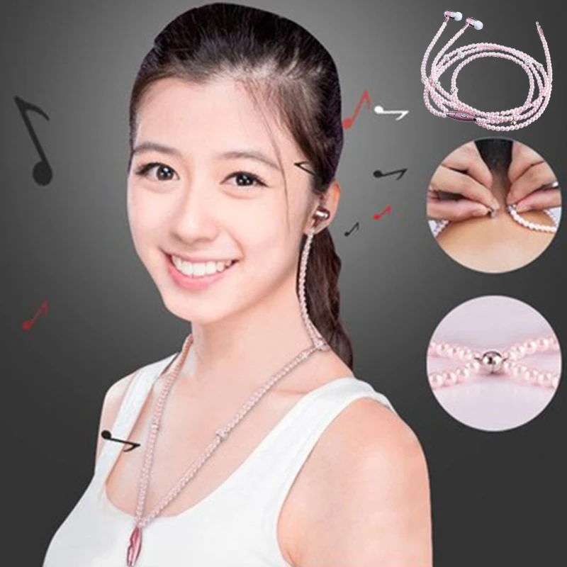 Жемчужное ожерелье, наушники-вкладыши, розовое ожерелье со стразами, ювелирные изделия, бусины, наушники с микрофоном для Samsung, Xiaomi, на день рождения, подарки для девушек
