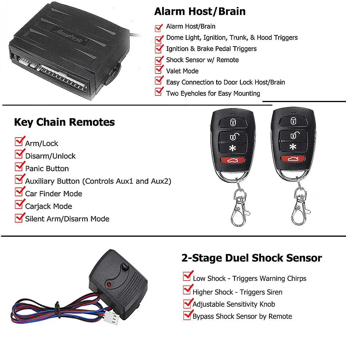 Удаленная Автомобильная сигнализация, БЕСКЛЮЧЕВОЙ вход, безопасность + 4-дверный силовой замок, привод, комплект двигателяСпецификация:Состояние: новоеМодель: FAI-330 и FAI-586Название продукта: Автомобильная сигнализацияЦвет: как на фотоМатериал: металл, пластикОсобенности: БЕСКЛЮЧЕВОЙ входКоличество пультов в комплекте: 2Количество приводов замка: 4MPN: FAI-586 и FAI-330Мобильность:Представляем автомобильную сигнализацию «сделай сам» с системой бесключевого входа. В комплект входят 4 дверных замка. С двумя входящими в комплект главными приводами вы сможете автоматически запирать и разблокировать все двери при блокировке или разблокировке любой из двух передних дверей. Когда вы запираете или разблокируете входные двери, все остальные двери тоже автоматически запираются или разблокируются! Эта функция может быть включена или отключена для любой или обеих входных дверей. Вы также сможете заблокировать и разблокировать свой автомобиль с помощью обоих 4-кнопочных пультов!Особенности:В этом комплекте есть функция автомобильного поисковика, которая будет мигать фарами на вашем автомобиле.Добавьте реле, и он также зазвонит вам! Если у вас есть мотор для открытия багажника, этот комплект позволит вам открыть багажник с помощью пульта дистанционного управления.Наконец, если у вас есть оконный модуль или любой другой аксессуар, которым вы хотите управлять, этот комплект позволяет управлять до 2 дополнительных устройств с помощью пульта дистанционного управления.Функции безопасности:1. Уничтожение стартераОтключает автомобиль от запуска во время включения сигнализации.2. Сценический датчик удараНизкое воздействие заставляет sire n издавать звуковой сигнал, предупреждающий чирканье, в то время как более крупные воздействия вызывают сигнал тревоги.3. Задержка запуска купольсветильникПри включении сигнализация не будет полностью включать сигнализацию до тех пор, пока не будут закрыты все двери.4. Триггер зажиганияКогда система сигнализации включена, сигнал тревоги зазвучит, если зажигание получает питание/работает.5. Штифт капота и/или триггер багажникаКогда система сигнализации включена, сигнал тревоги будет звучать при открытии капота и/или багажника.6. Режим CarjackЕсли ваш автомобиль угнан, Включите эту функцию, и срабатывает сигнал тревоги через 60 секунд после того, как он будет украден.7. Режим камердинераПри включении пульты дистанционного управления блокируют и разблокируют двери без включения сигнализации.Дверной замок и контроллер1. Управление передним замкомПри запирании или разблокировке передних дверей все остальные двери запираются и разблокируются.Эту функцию можно включить только для одной, обеих или ни для одной входной двери.2. Автоматическая блокировка/разблокировкаПри включении двери автоматически блокируются и разблокируются при включении и выключении автомобиля.3. Автоматическое включение последней двериКогда включено, после выключения двигателя сигнализация включится через 30 секунд после выхода из автомобиля.4.2x дополнительные выходыЭти дополнительные выходы можно использовать для открытия багажника, свертывания окон и т. Д. (необходимы дополнительные модули).Расширенные функции безопасности:1. Байпас датчика удараКогда вы обходите пульт дистанционного управления, сигнал тревоги игнорирует датчик