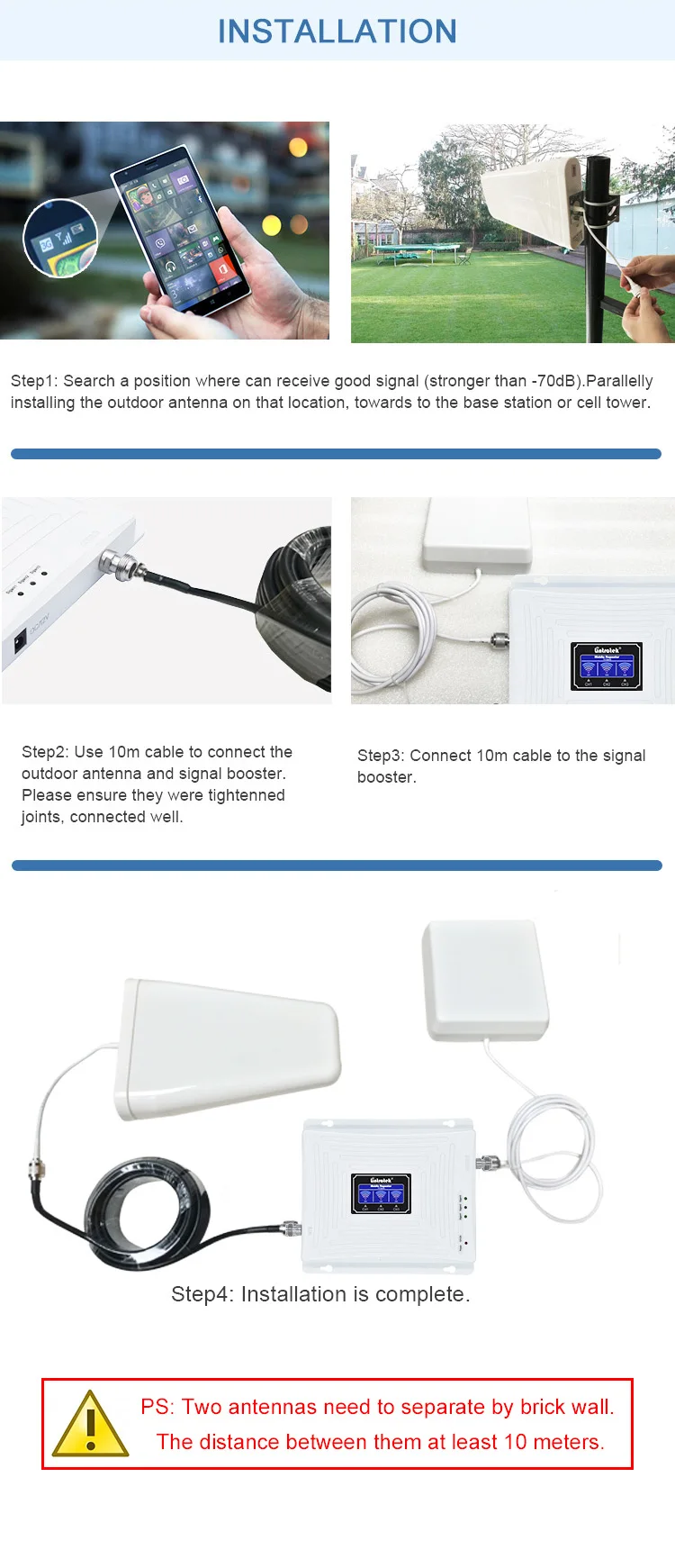 Комплект изготовлен из хороших материалов, в каждой части, антенна, кабель, корпус твердого металлического приемника, широкий дисплей с тремя сигналами, GSM,3g и 4G. Istallation действительно trivial, также кабели и разъемы являются качественными, после подключения и включения вам не придется делать другой, важно и место антенны, где получает хорошее, чтобы получить хороший сигнал в вашем доме. Для нас бесшумно размножается на 2 этажах дома и всей поверхности, которая составляет 150 кв. М. Действительно удовлетворенный продукт, который прибыл в течение 3/4 дней, он изменился с тех пор, как я телефон был мертвым :) надеюсь, трудно!