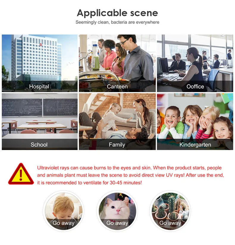 1: УФС-лучи наносят вред глазам и коже, поэтому, когда лампа светильник, пожалуйста, не смотрите на лампу. И когда лампа работает, люди/Домашние животные/растения должны покинуть комнату. 2: Если есть растения или аквариумы, которые не могут двигаться, накройте их непрозрачными газетами или тканью, тогда лучи UVC не проникают и не могут повредить их.