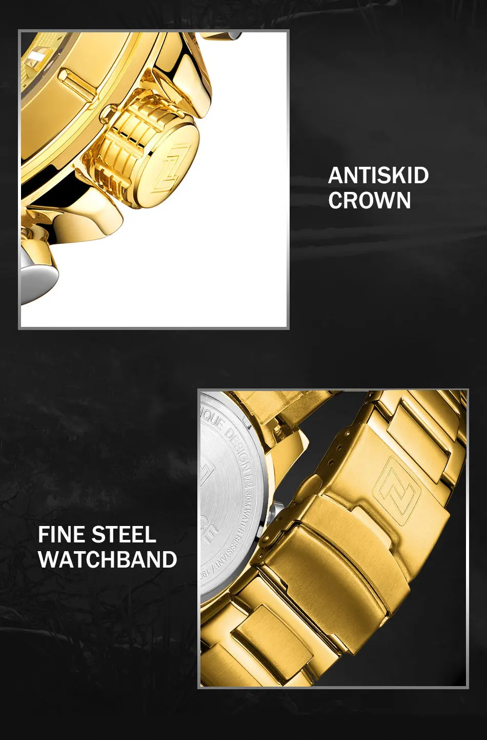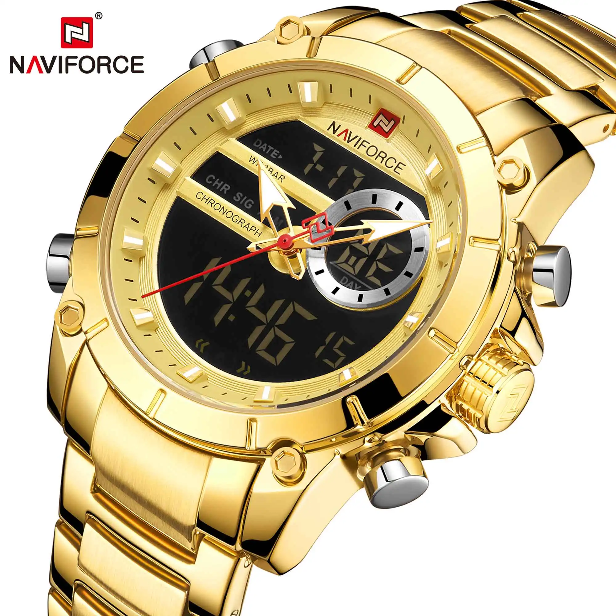 Часы наручные NAVIFORCE Мужские кварцевые в стиле милитари, водонепроницаемые золотистые стальные, с двойным дисплеем, 9163