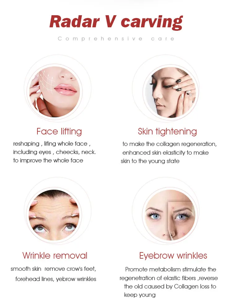 Что такое резьба по линии радара? Радар V резьба-это ручка HIFU для лифтинга лица, удаления морщин, затяжки кожи, формы лица, формы шеи... Это машина красоты для домашнего использования, новый дизайн, основанный на технологии механических волн и RF-принцип. Он имеет эффект лица, продукт свинцово-кислотный, стимулирующий регенерацию фасциевого слоя и коллагена. Описание продукта: Это Тип Мини V-max лицевой подъемной машины. Это машина красоты для домашнего использования, новый дизайн, основанный на технологии механических волн и RF-принцип. Он имеет эффект лица, продукт свинцово-кислотный, стимулирующий регенерацию фасциевого слоя и коллагена. Инструментальный преимущества: 1. Глубина: напрямую работает на SMAS 2. Температура: неинвазивные стимулирует восстановление-поколение collegan. 3.Hifu: сфокусированный ультразвук работает только в области лечения, не причиняет вреда окружающим. 4. Без времени восстановления: без вреда для повседневной жизни. 5. Не нужно делать хирургию. 6. Удобно при занятиях: энергия пропускает кожу, не причиняет вреда. Управление руководство Операция на шее: мы рекомендуем начать с линии шеи на кнопках, от ключицы вдоль шеи до ягодиц, от двойного подбородка до горла. Области горла запрещены для использования, затем от двойного подбородка до лимфы вокруг, не забывайте, что область горла запрещена; Пользователь может 3-4 раза выполнять такие действия, как свободная кожа. Операция по лицу: интенсивность начинается с самой низкой, от ягодиц до скул, затем от рта до ушей, используя подъемные манипуляции, последний шаг со стороны носа вдоль яблока, подтяжка мышц до висков. Пользователь может 3-4 раза выполнять такие действия, как свободная кожа. Операция вокруг глаз: интенсивность начинается с самой низкой, от Подъема скулы до храма вокруг, затем от угла вокруг глаз, до линии вокруг волос, не забывайте, что верхние века и орбитальные кости запрещены. Пользователь может 3-4 раза выполнять такие действия, как свободная кожа. Операция на лбу: интенсивность начинается с самой низкой, от подъема бровей до линии вокруг, подтяжки бровей посередине до висков, подтяжки бровей до линии вокруг, от кнопки вверх, от офриона до висячих точек, мы рекомендуем брови не делать этого; Пользователь может 3-4 раза выполнять такие действия, как свободная кожа. Примите к сведению, что Во время работы картридж не может оставаться в одном месте, делая повторяющуюся работу, двигаясь с постоянной скоростью с самого начала, мы рекомендуем регулировать интенсивность с самой низкой, затем, в зависимости от области обработки, для регулировки интенсивности, настраивайте на максимальный толерант клиентов, во время работы, Вы будете чувствовать себя горячим, в какой-то чувствительной области будет ощущаться небольшое напряжение, после операции, если вы почувствуете боль и отечность, все в нормальной ситуации. Вывод: Для нормальной кожи, в первые 5 раз мы рекомендуем три дня один раз, после 5 раз работы, 5 дней один раз. Для чувствительной кожи, в первые 5 раз, мы рекомендуем 5-7 дней один раз, после 5 раз работы, 10-15 дней один раз, 8-10 раз один лечение. Вы можете сконструировать время лечения в соответствии с личной свободностью кожи. После того, как операция может иметь разную степень детоксикации, метаболизм: прыщи, акне, колючие, Рвущие, зудящие, легкие отекы, болезненные, вс