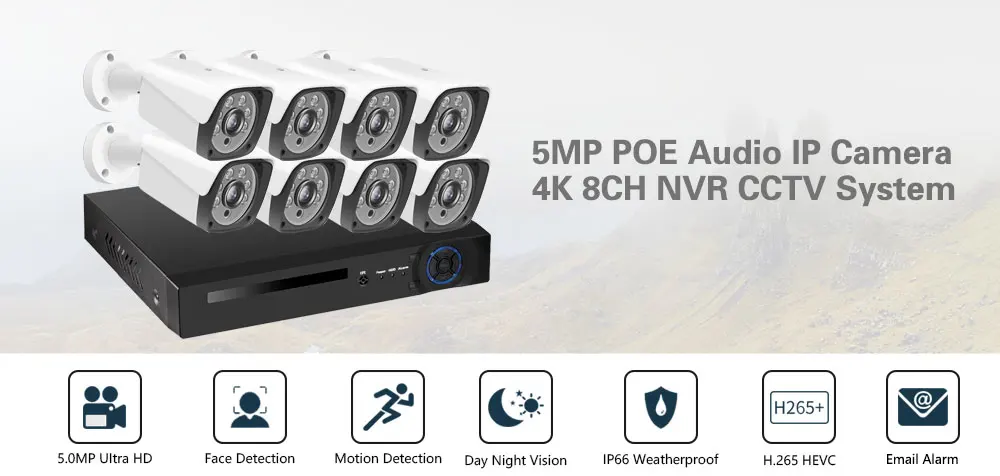 1. Ультра HD 4K дисплей высокой четкости, NVR может поддерживать 8 МП и 4K max, вы можете подключить 720p,1080p,3mp,4mp ,5mp, камеры 8mp & 4k с нашим POE NVR;2. Ультра HD 5MP POE ip-камера, металлический материал, IP66 водонепроницаемый, подходит для внутреннего и наружного использования, надежная Домашняя безопасность;3. Наш NVR поддерживает распознавание лиц, воспроизведение лиц, обеспечивает ультра высокое разрешение видео наблюдения, обеспечивая максимальную детализацию и четкость в наличии;4. Наш NVR и камеры поддерживают расширенное H.265 Сжатие видео, питание через Ethernet, подключи и работай, прост в использовании;5. Все камеры встроены в микрофон, поддерживают аудиозапись, поддерживают режим ночного видения Ultra HD;6. Поддержка обнаружения движения, оповещения по электронной почте, воспроизведения видео и многоязычности;7. Поддержка Android,Iphone,Ipad,PC,VMS,P2P view;8. Удаленный доступ в любом месте, в любое время;