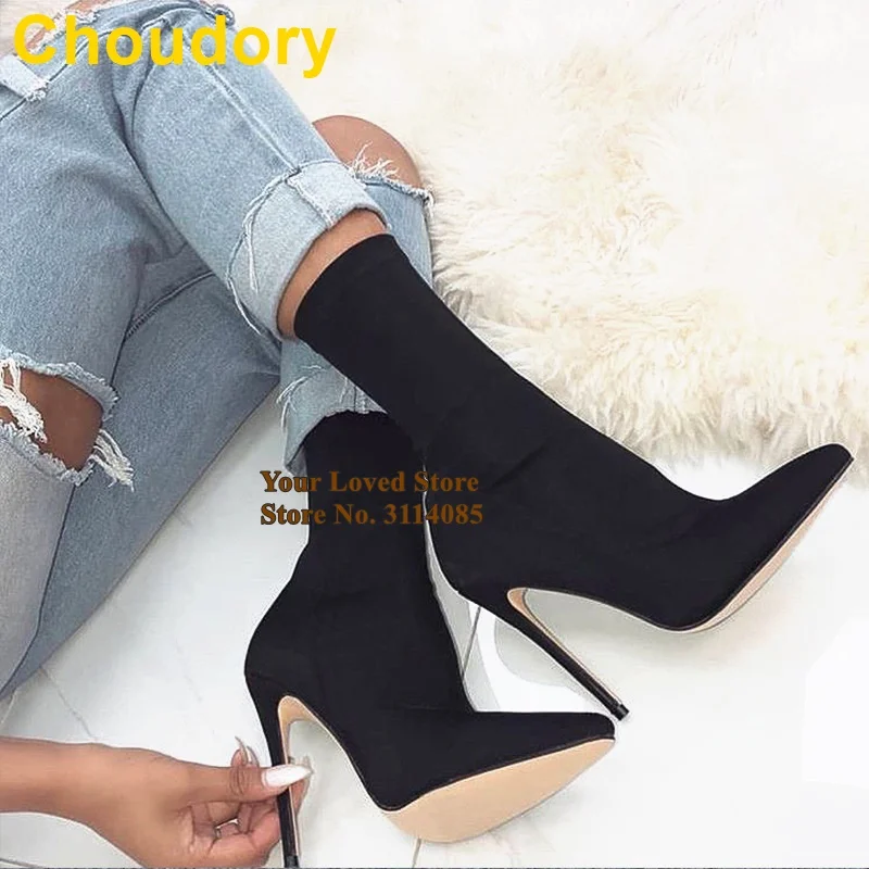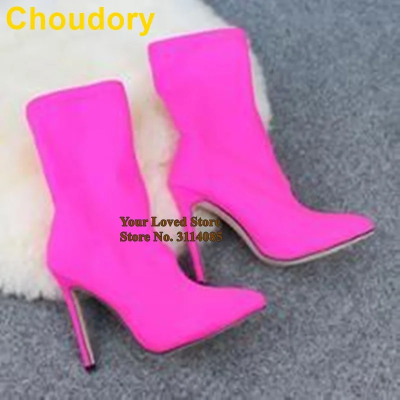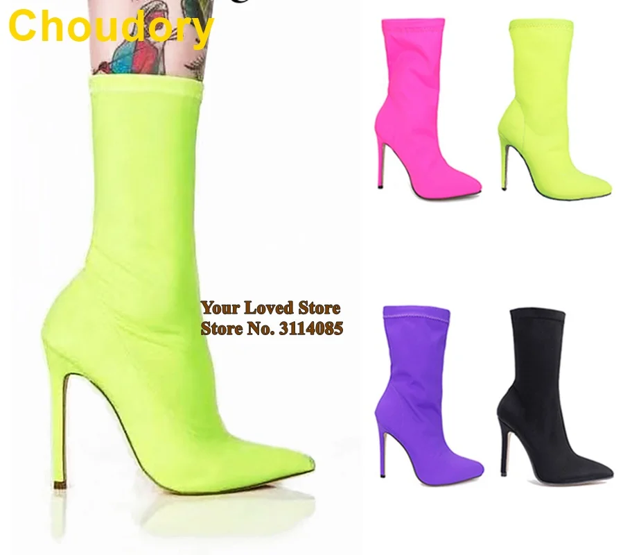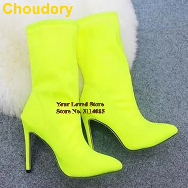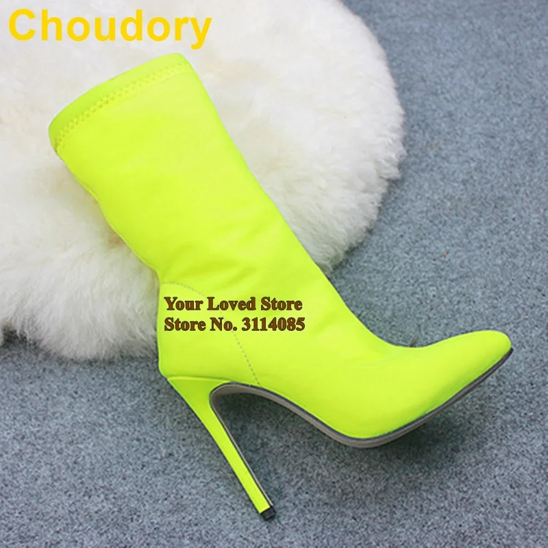 Сапоги до середины икры из эластичной ткани с лайкрой, с острым носком, на шпильке, светло-желтые, розовые, туфли-лодочки