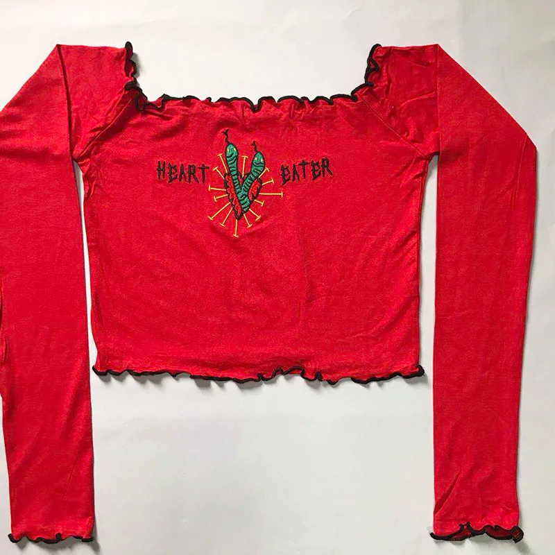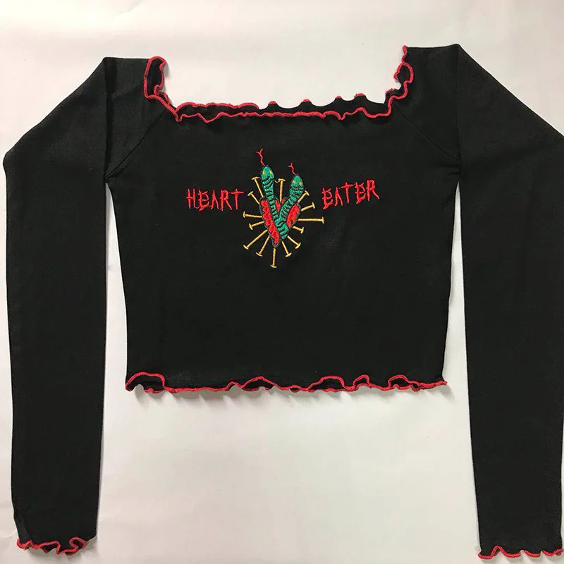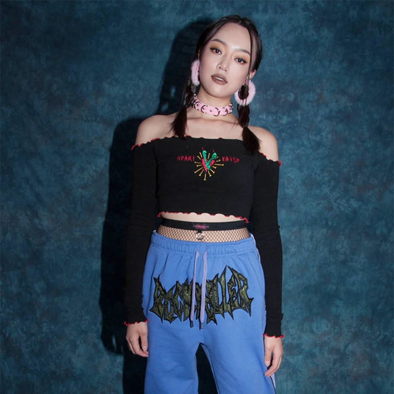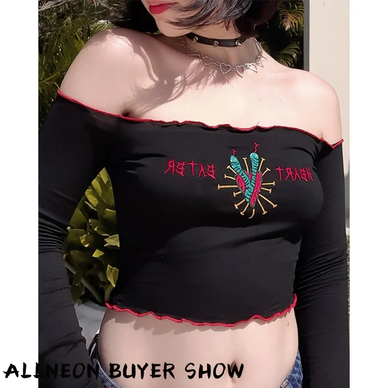 ALLNeonготические футболки с открытыми плечами, однотонные укороченные топы с вышивкой спереди и длинными рукавами, Модные Весенние футболки для девочек в стиле панк