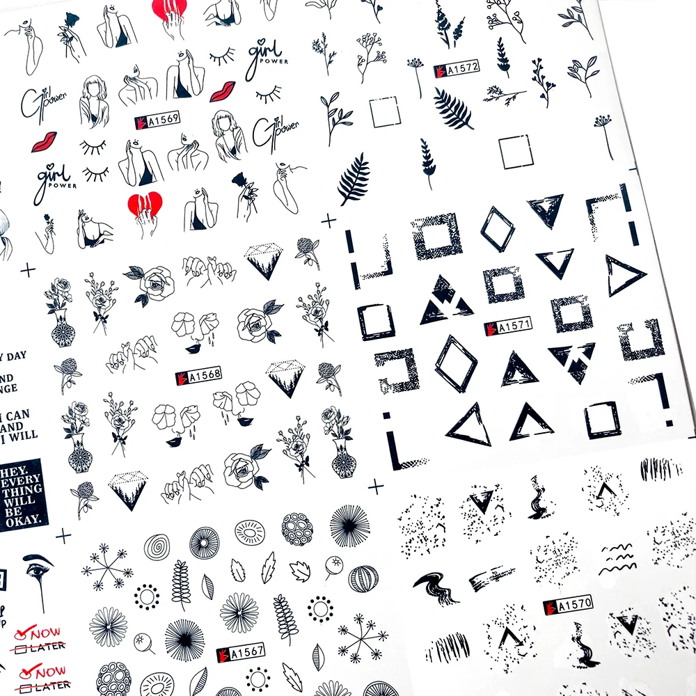 Наклейка для ногтей с черными цветами, листьями, сексуальная женщина, переводная вода с русскими буквами, повязка для ногтей, украшение для маникюра A1561, 12 видов конструкций