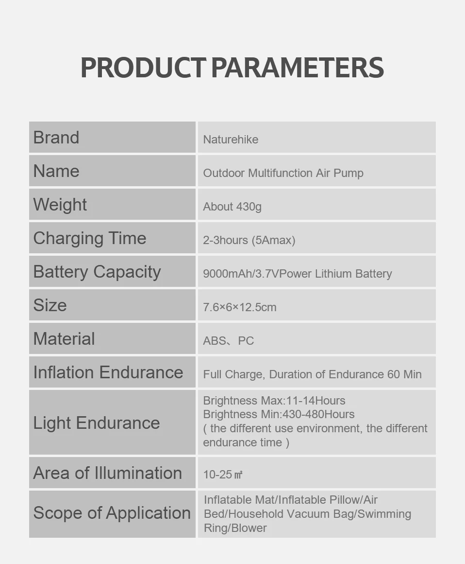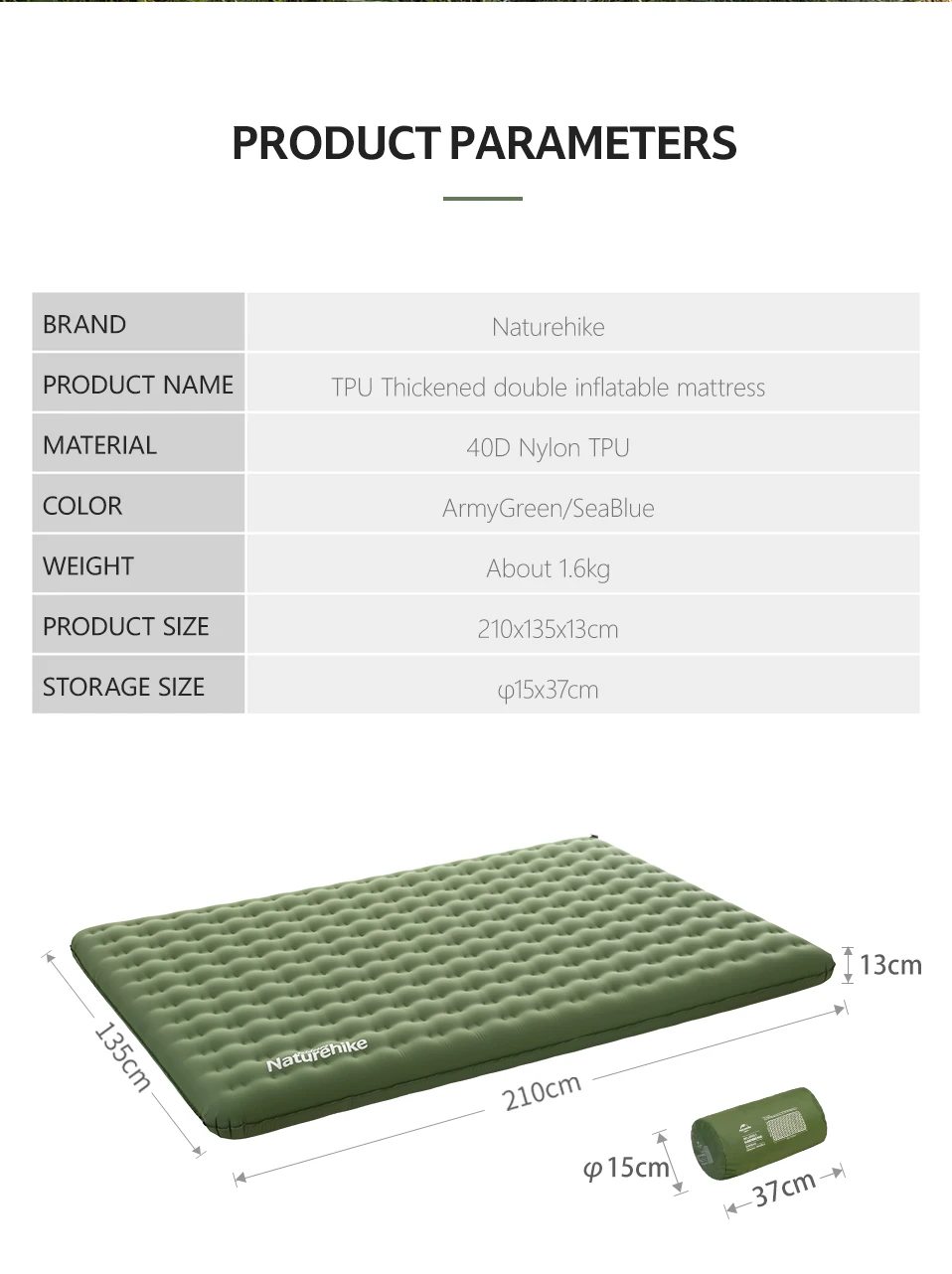 Бренд: NaturehikeНаименование товара: надувной воздушный матрас для 2 человекМатериал: 40D нейлон ТПУЦвета: зеленый/морской синийВес: около 1,6 кгРазмер: 210x135x13смРазмер упаковки: ф15х37см