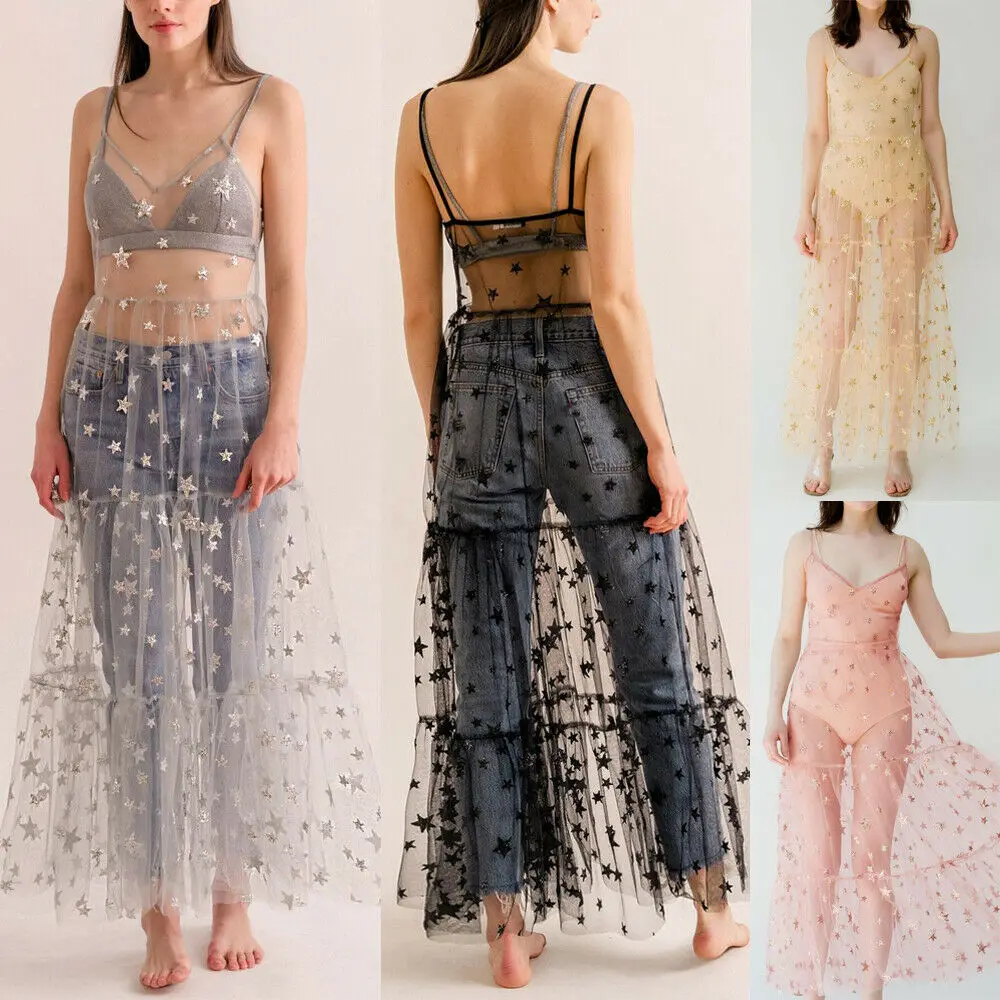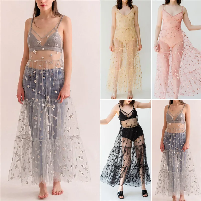 Женские прозрачные Макси-платья в стиле бохо, модное женское длинное платье, летнее Прозрачное платье со звездами, Лидер продаж
